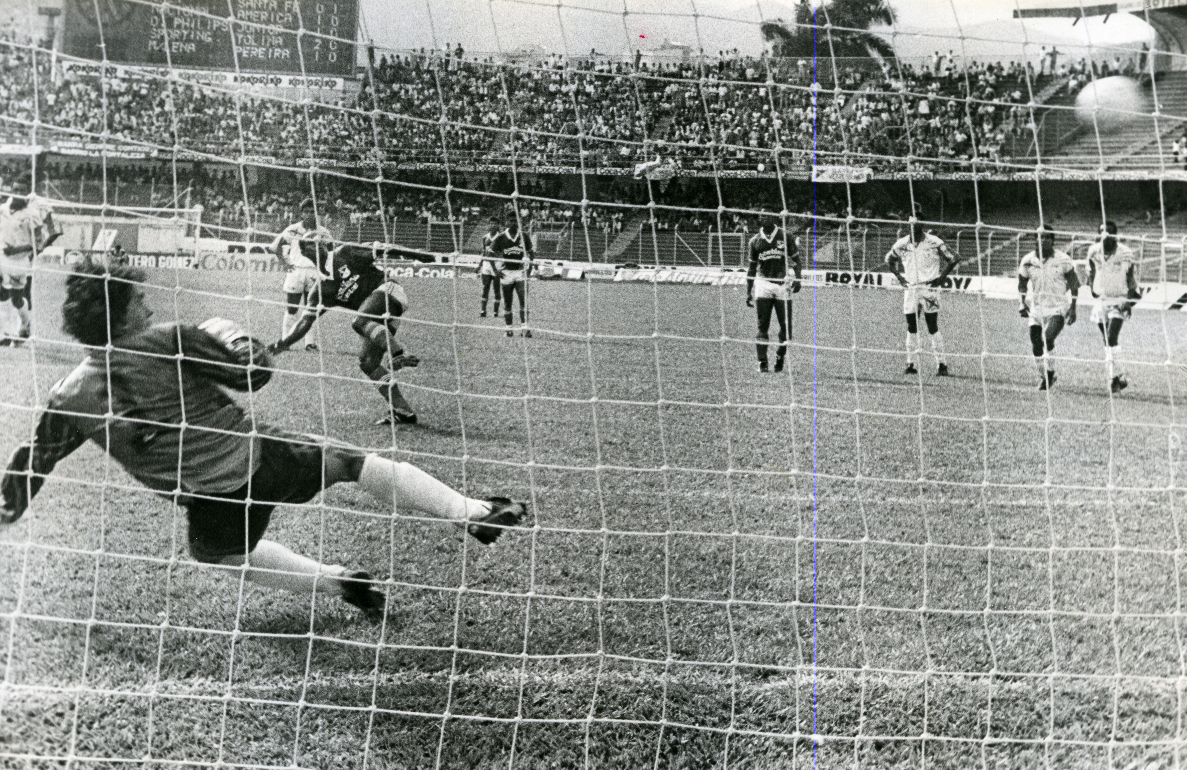 Partido entre los equipos de fútbol, Deportivo Cali y Santa Fe realizado en el Estadio Olímpico Pascual Guerrero. Se aprecia al jugador Carlos "La Gambeta" Estrada, cobra tiro penal