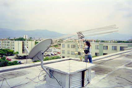 Gonzales Mosquera, Y.  (2005). Vista panorámica tomada desde la terraza de un edificio, donde se destacan algunas antenas y detrás de ellas una joven tomando fotografías. Santiago de Cali: Biblioteca Departamental Jorge Garces Borrero.