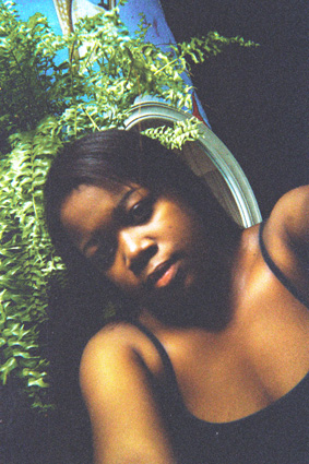 Primer plano de una mujer joven, de raza negra con su mirada dirigida hacia la cámara. Al fondo un helecho y un espejo, sobre un muro de color azul. Imagen tomada en el interior de una vivienda, con diagonal hacia la derecha y escasas condiciones de luz.