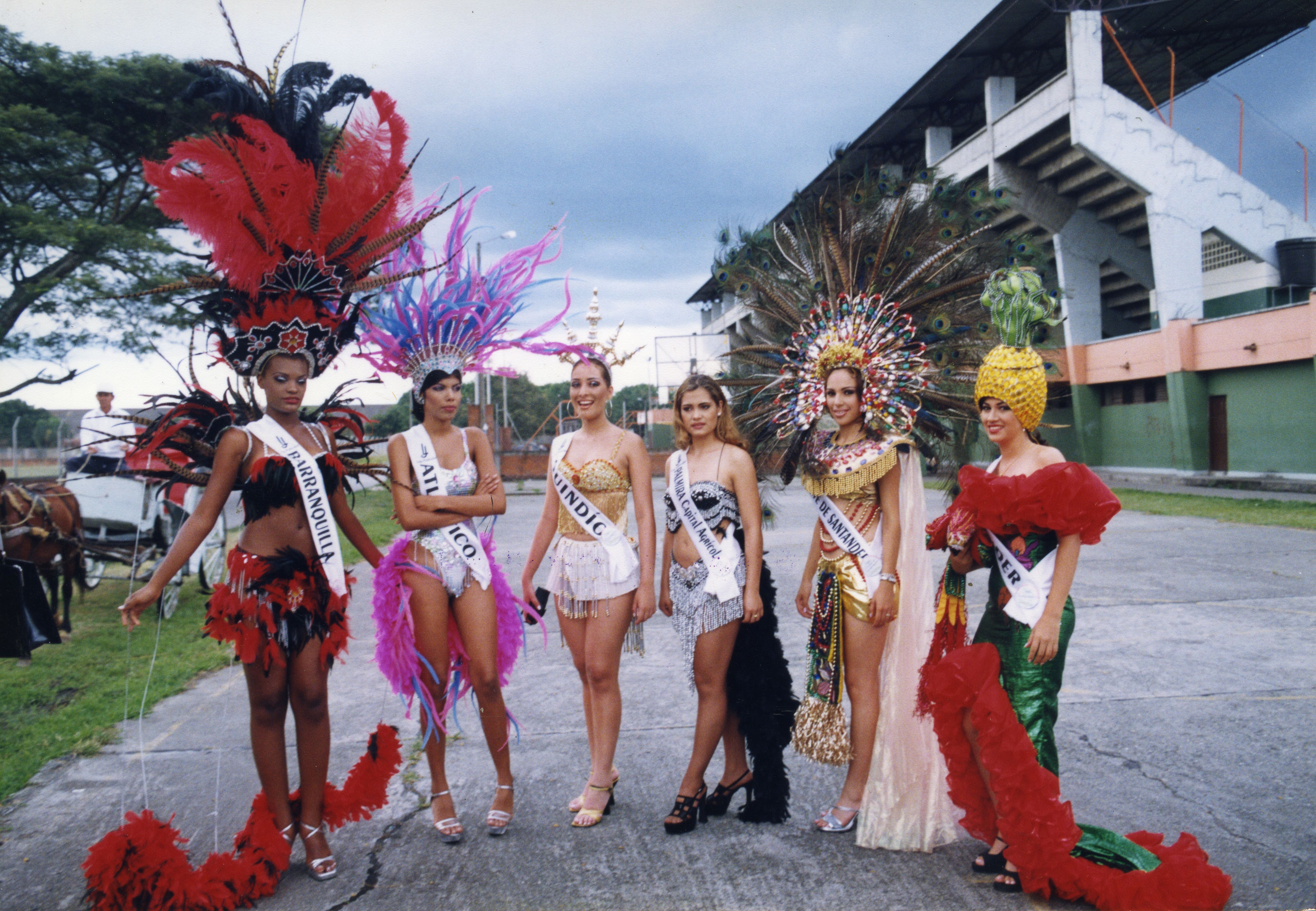 Candidatas al Reinado Nacional de la Agricultura. Se aprecia a las reinas con trajes típicos y posando para la cámara. Observamos fachada del estadio Francisco Rivera Escobar