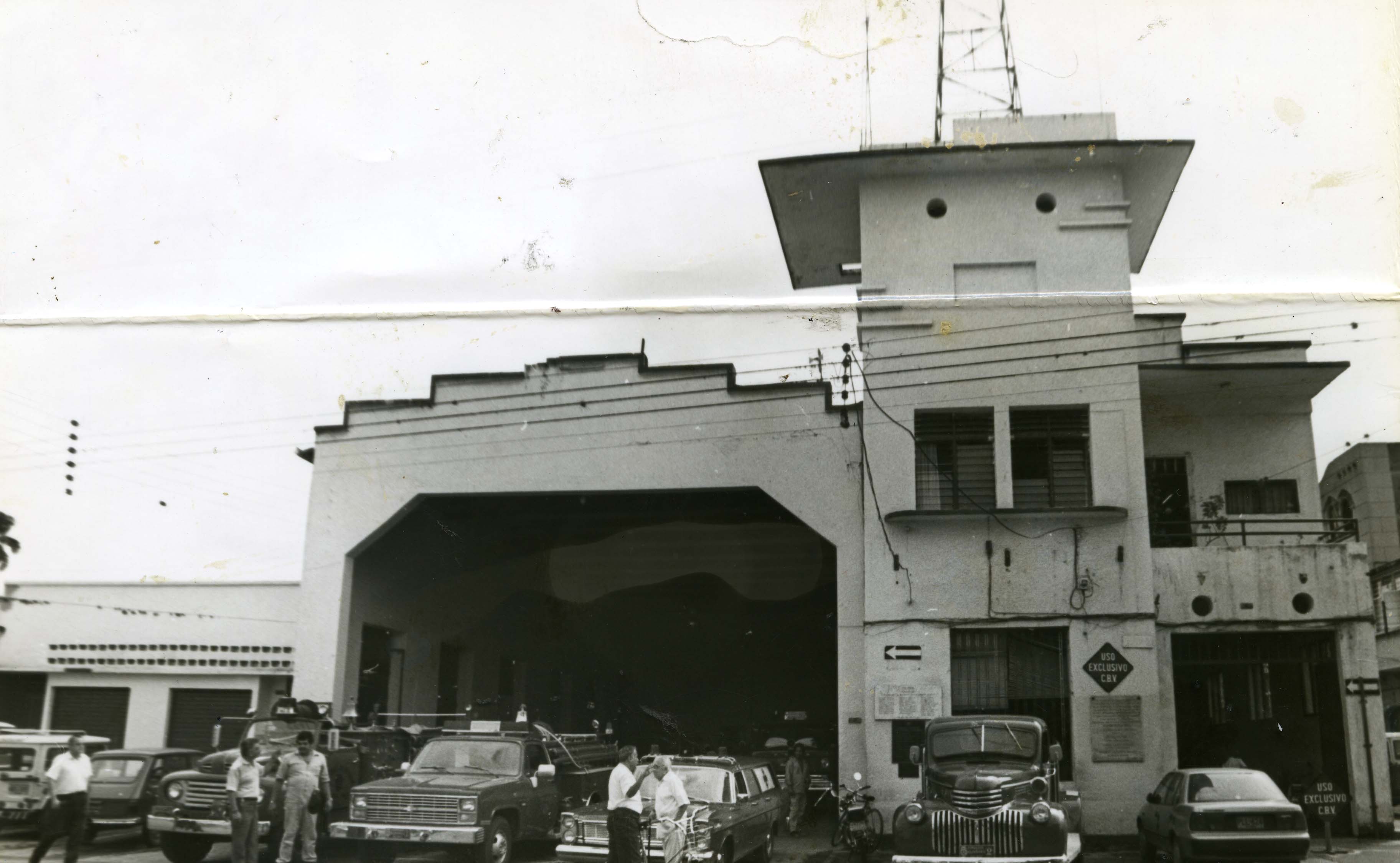 Cuerpo de bomberos de Palmira, se puede apreciar los carros, la arquitectura del edificio, y las personas // El Archivo del Patrimonio Fotográfico y Fílmico del Valle del Cauca es responsabilidad de la Biblioteca Departamental del Valle Jorge Garcés Borrero, por convenio de cooperación suscrito con la Secretaria de Cultura Departamental, con el fin de aunar esfuerzos para su conservación, preservación y divulgación del Archivo entre la comunidad Vallecaucana, especialmente entre los estudiantes e investigadores que visitan la Biblioteca, propiciando el su uso y consulta permanente. La universidad Icesi es un colaborador en el proceso de difusión, facilitando la tecnología que permite la consulta de las imágenes.