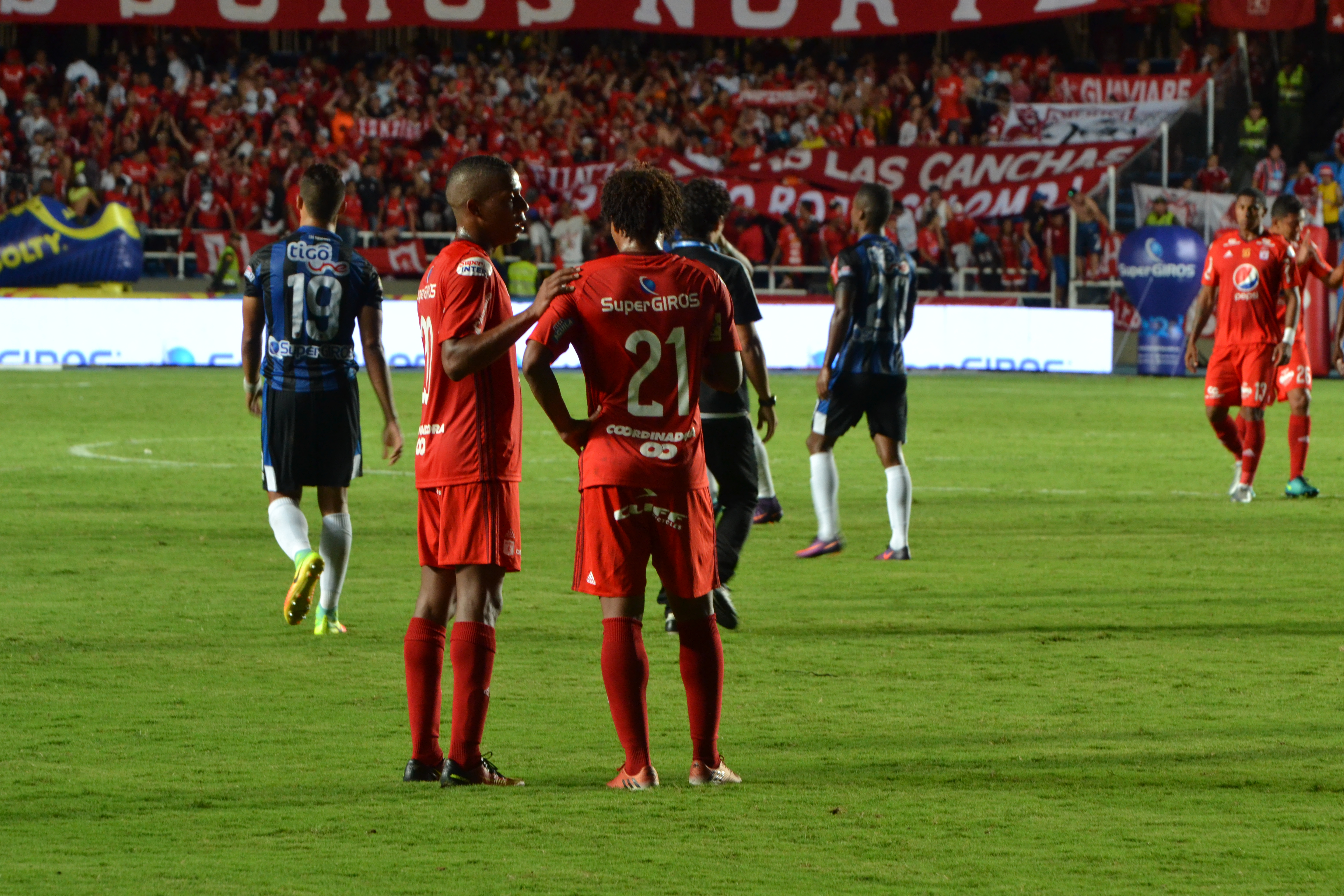 Registro fotográfico de jugadores americanos y del junior, al fondo se aprecia la hinchada del equipo escarlata.