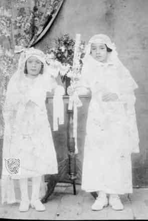 Velos blancos, trajes largos, velones y moños , escapularios y estampitas de niños recibiendo a Dios. Detalles materiales para ritos muy espirituales. 1945.