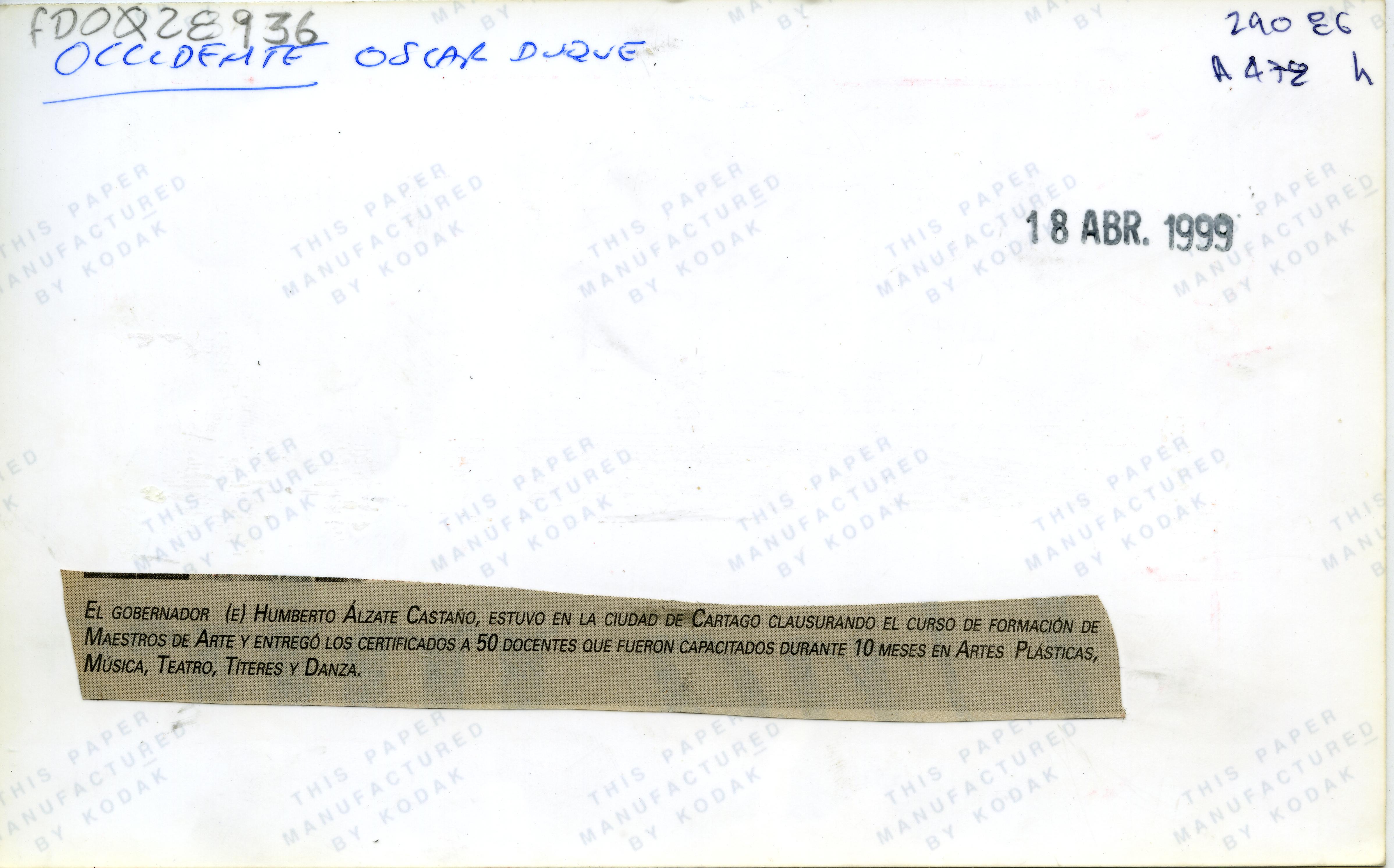 Reverso "El Gobernador Humberto Alzate Castaño, estuvo en la ciudad de Cartago clausurando el curso de formación de maestros de arte y entregó los certificados a 50 docentes que fueron capacitados durante 10 meses en artes plásticas,música, Teatro,Títeres y danza.”