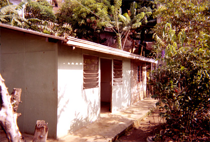 Plano medio. Imagen de una vivienda prefabricada en el sector rural. Al lado derecho y superior de la imagen se destaca gran cantidad de arboles y plantas.