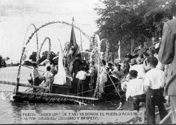 Fiestas de la virgen del Carmen, desfile en balsas por el río Cauca. La Unión, fecha aproximada, 1950.