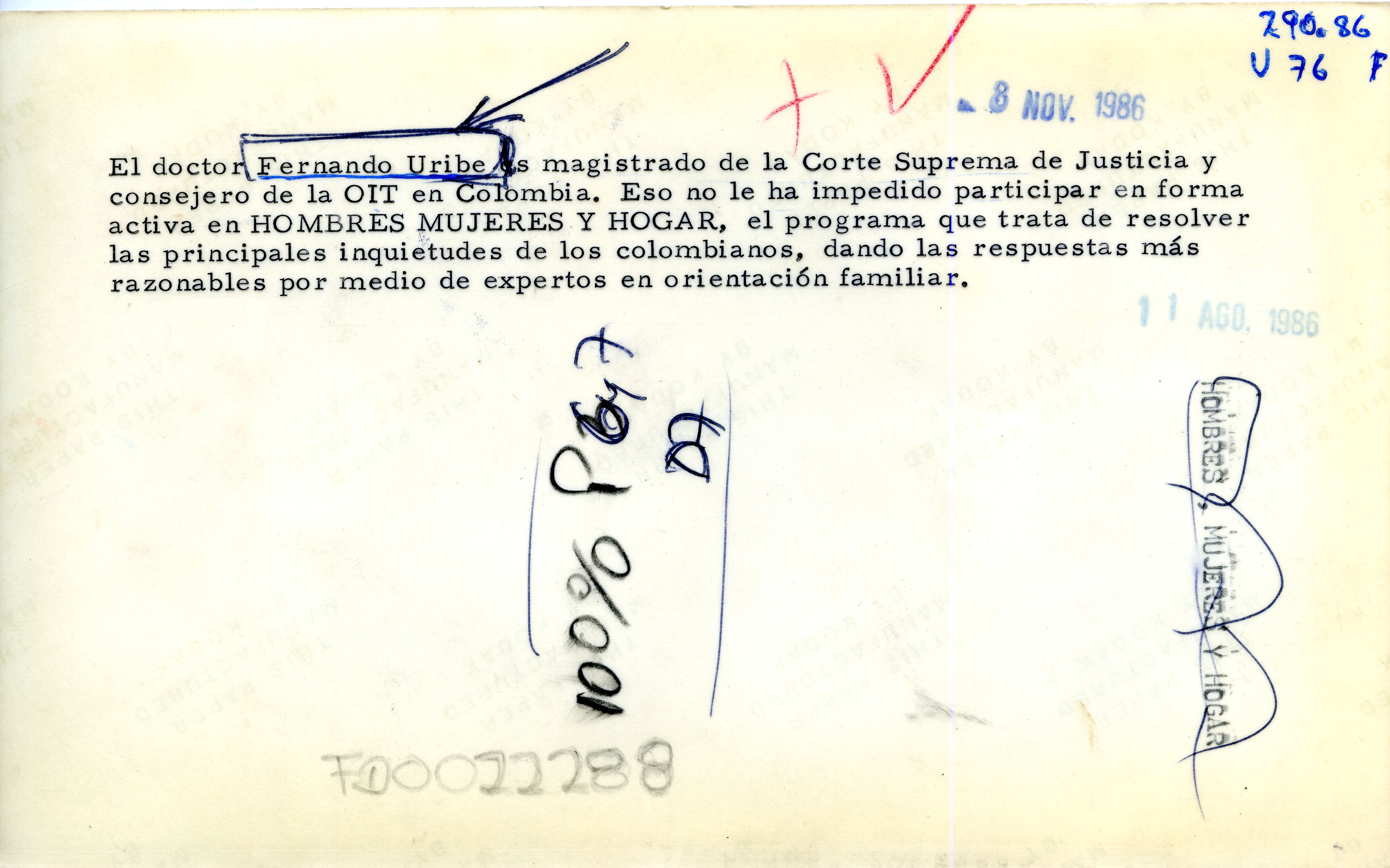 En la fotografía podemos apreciar el rostro del Presidente de la Corte Suprema de Justicial, el doctor Fernando Uribe Restrepom, quien está sentado y luce un treje formal. Al reverso de la fotografía se anexa escrito: "El doctor Fernando Uribe es magistrado de la Corte Suprema de Justicia y consejero de la OIT en Colombia. Eso no le ha impedido participar en forma activa en HOMBRES MUJERES Y HOGAR, el programa que trata de resolver las principales inquietudes de los colombianos, dando las respuestas más razonables por medio de expertos en orientación familiar."