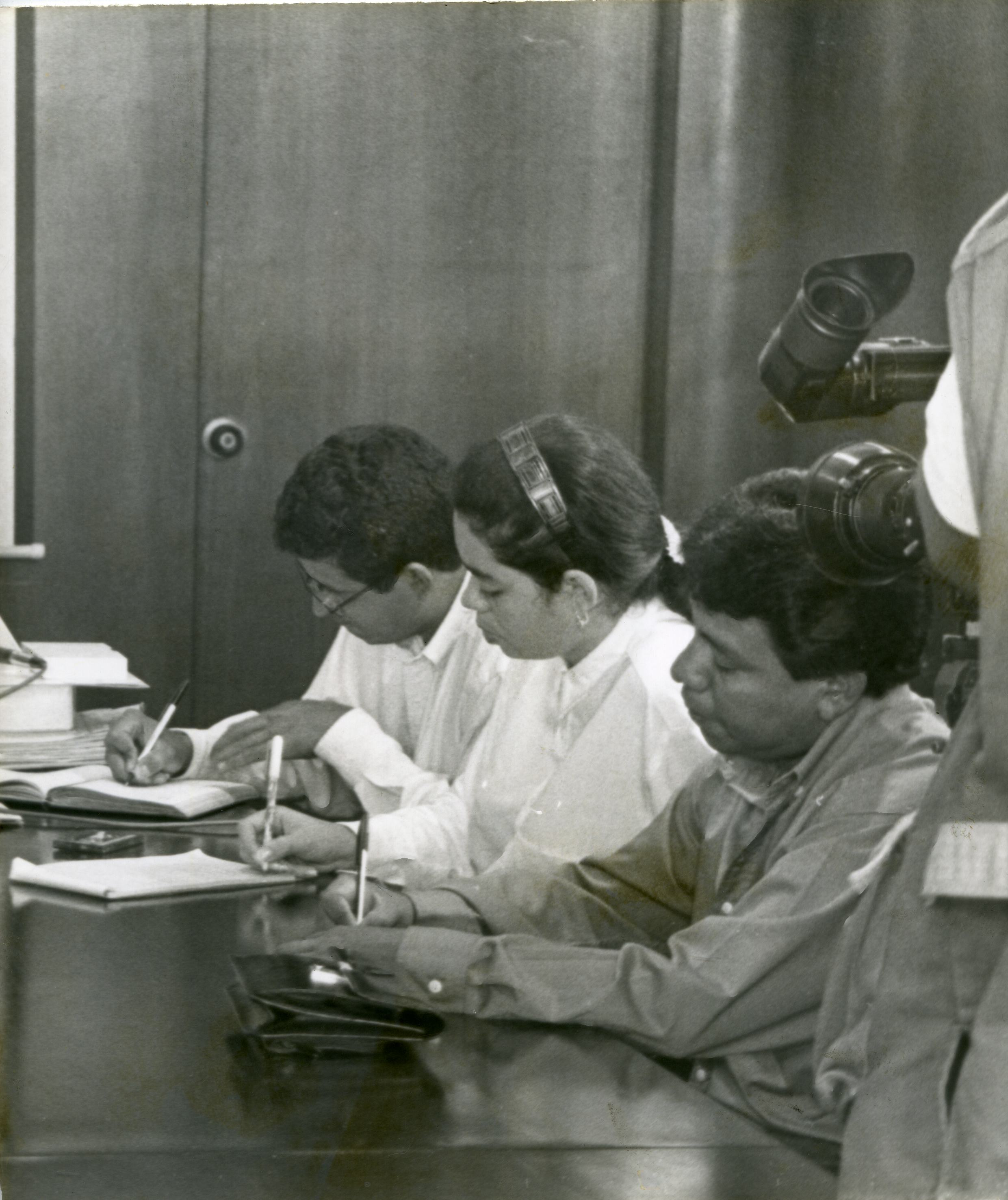 Se observa periodistas colombianos sentados tomando apuntes, de derecha a izquierda Diego Medina, Blanca Liliana Martínez y Nelson Lobatón.