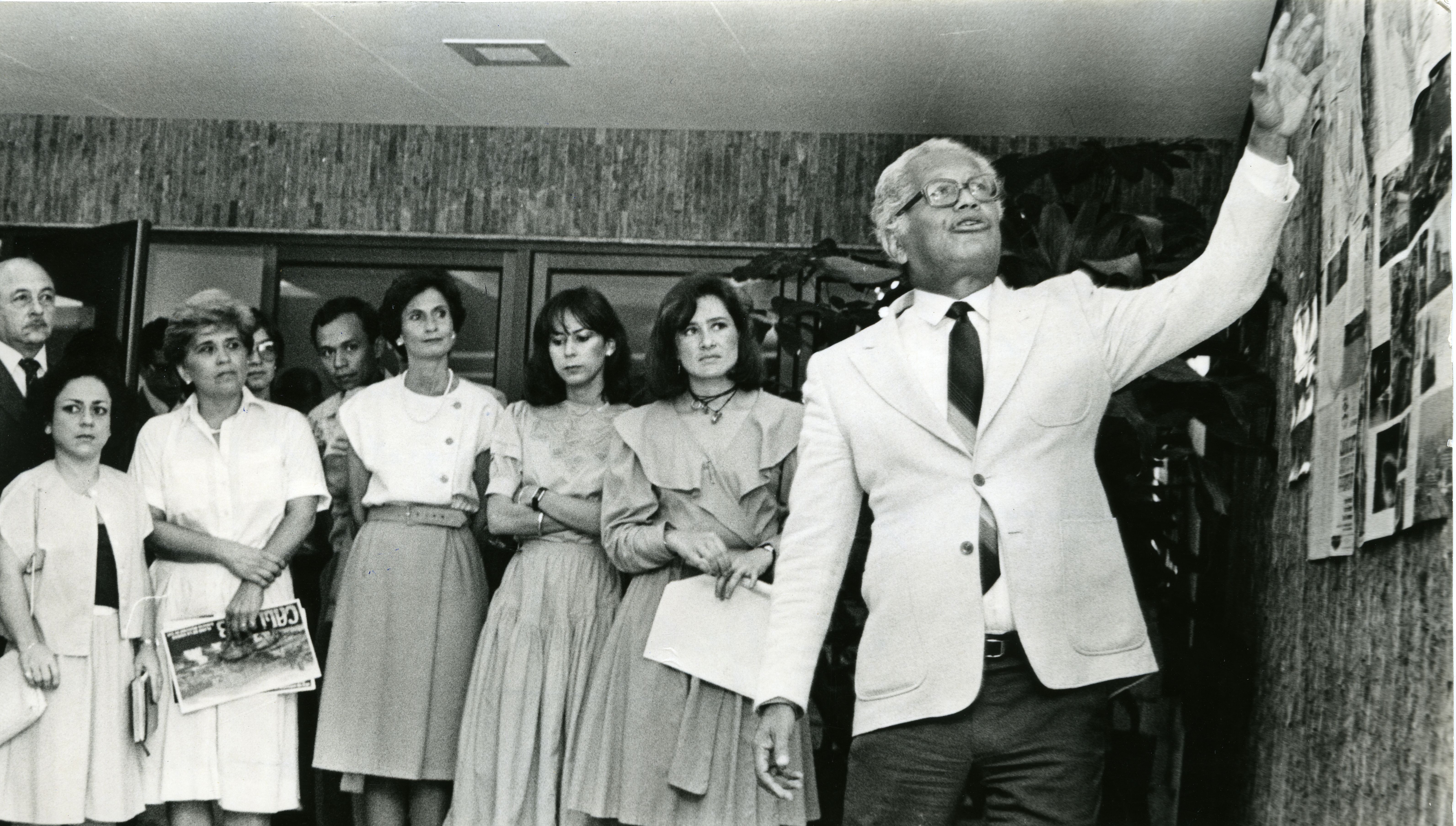Alcalde explica el proceso de urbanización en Cali, desde 1942 hasta 1983. Seaprecia a María Isabel Cruz, concejal, Elly burckhardt, Virginia de Lima, tesorera departamental, Lily Scarpetta y Liliana Bonilla, alcaldía