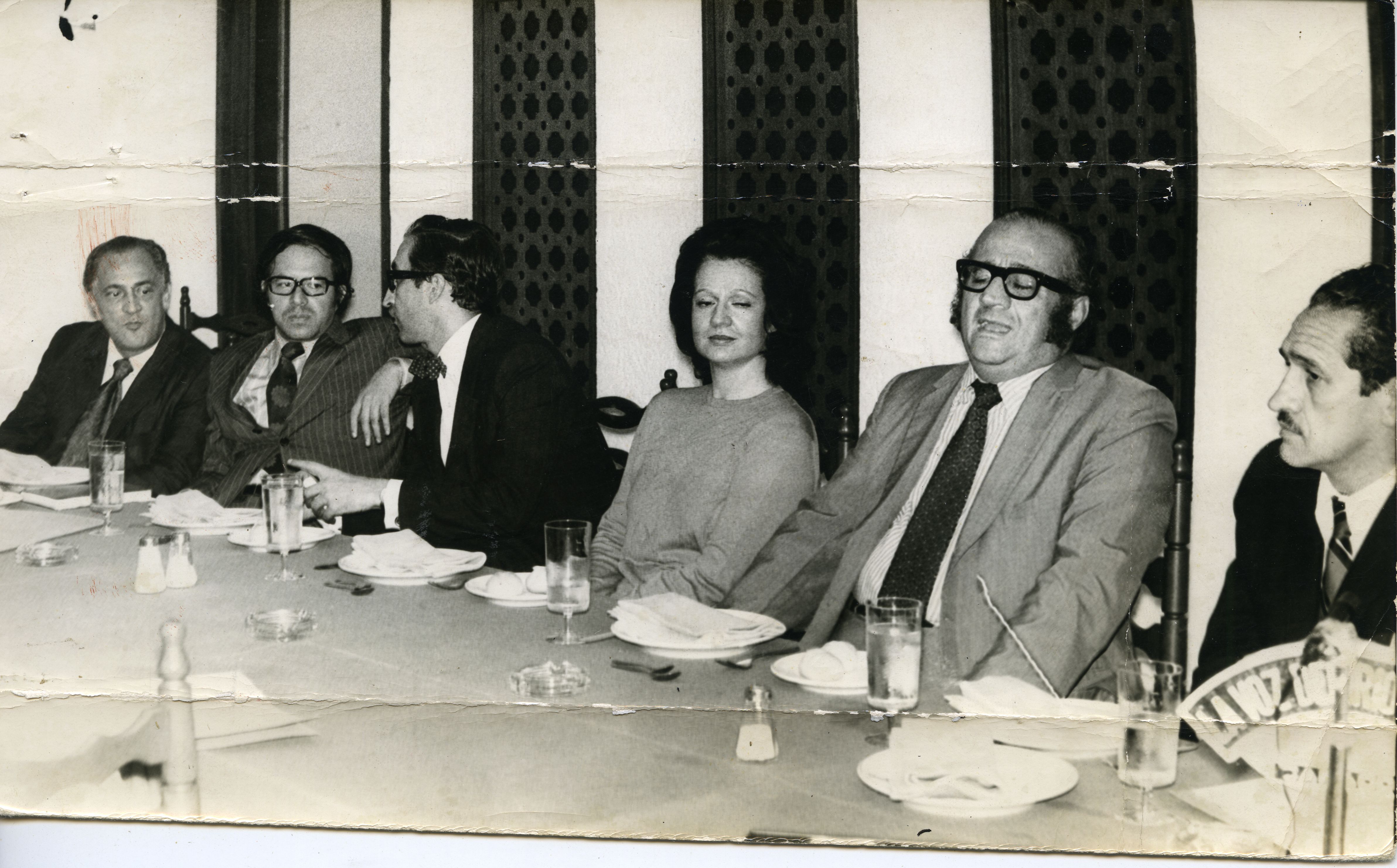 "En la foto se puede apreciar a un grupo de periodistas en lo que parece ser una cena, de izquierda a derecha: Álvaro Bejarano, Francisco Gómez V., Jorge A. Sanclemente, Clara Zamatzky de Bueno, Jaime Arango, Manuel V. Guevara."