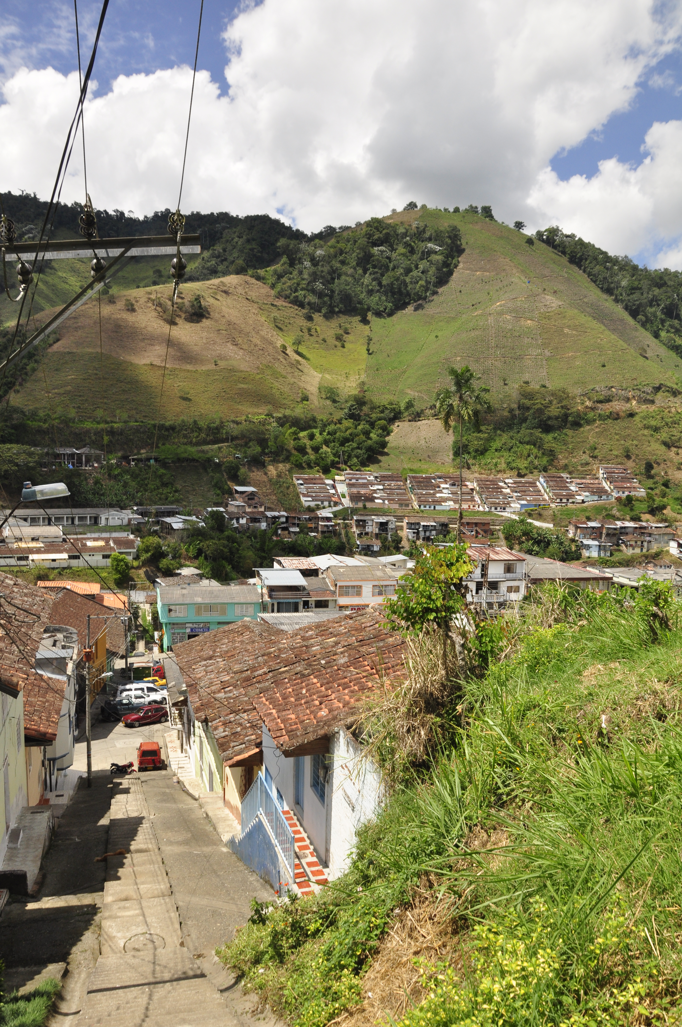 Argelia, Valle del Cauca. Fundado en 1904, por Manuel Mejía, José Antonio Murillo, Epifanio Chávez y Justiano Hincapié. Nombres: Agua Mona y después Medellíncito. Municipio desde 1956. Economía importante en agricultura, caficultura, ganadería, entre otros. Atractivo turístico: Playas del Rio Las Vueltas y sus fiestas patronales. Observamos en la imagen, calles, paisaje y las casas