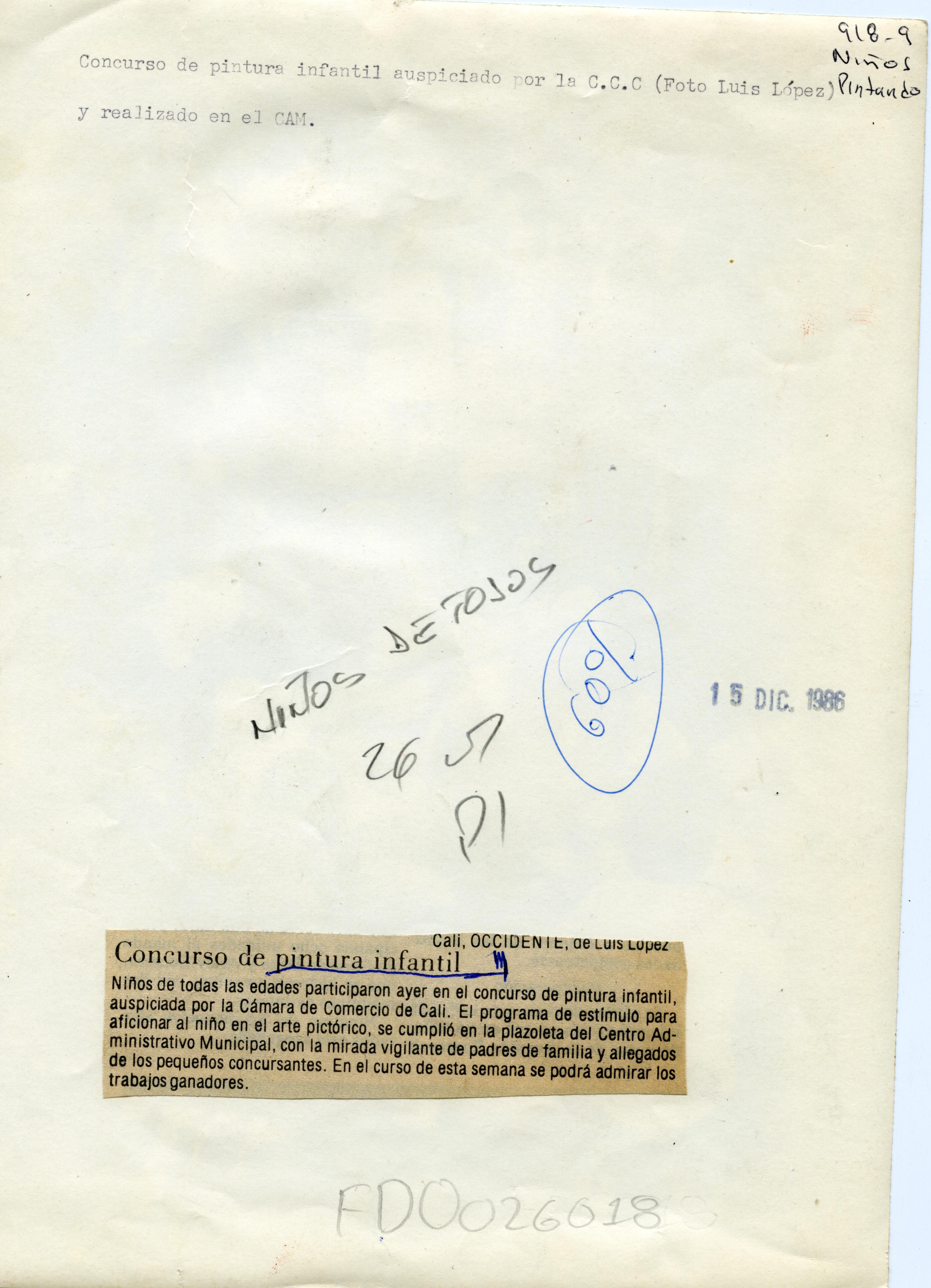 Niños de todas las edades participaron ayer en el concurso de pintura infantil, auspiciada por la cámara de comercio de Cali. El programa de estímulo para aficionar al niño en el arte pictórico, se cumplió en la Plazoleta del Centro Administrativo Municipal con la mirada vigilante de padres de familia y allegados de los pequeños concursantes. En el curso de esta semana se podrá admirar los trabajos ganadores