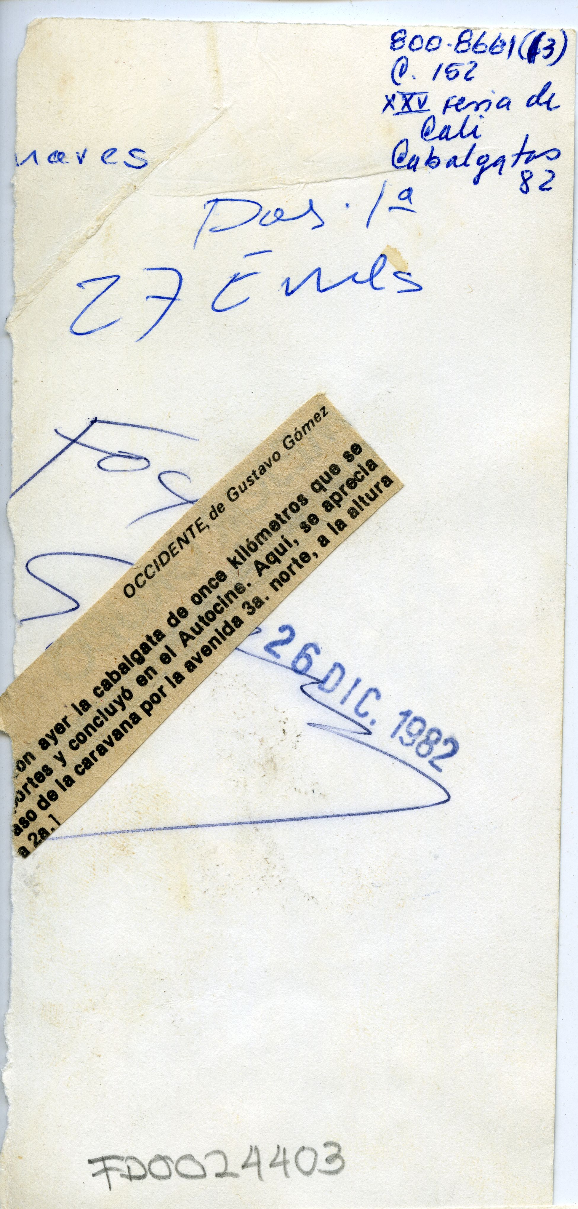 Occidente de Gustavo Gómez. Al reverso de la fotografía se anexa recorte: Ayer la cabalgata de once kilómetros que se... y concluyó en el Autocine. Aquí se aprecia pasó de la caravanA por la avenida 3 norte