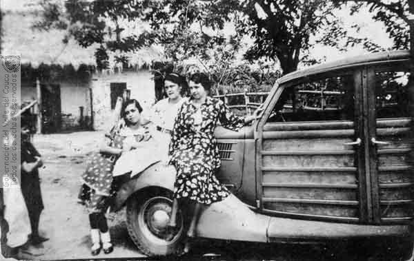 Encuentro familiar en la casona de La Venta. Jade Santacoloma, Deyanira Echeverry Isabel Echeverry, junto a una vieja berlina San Pedro. 1957