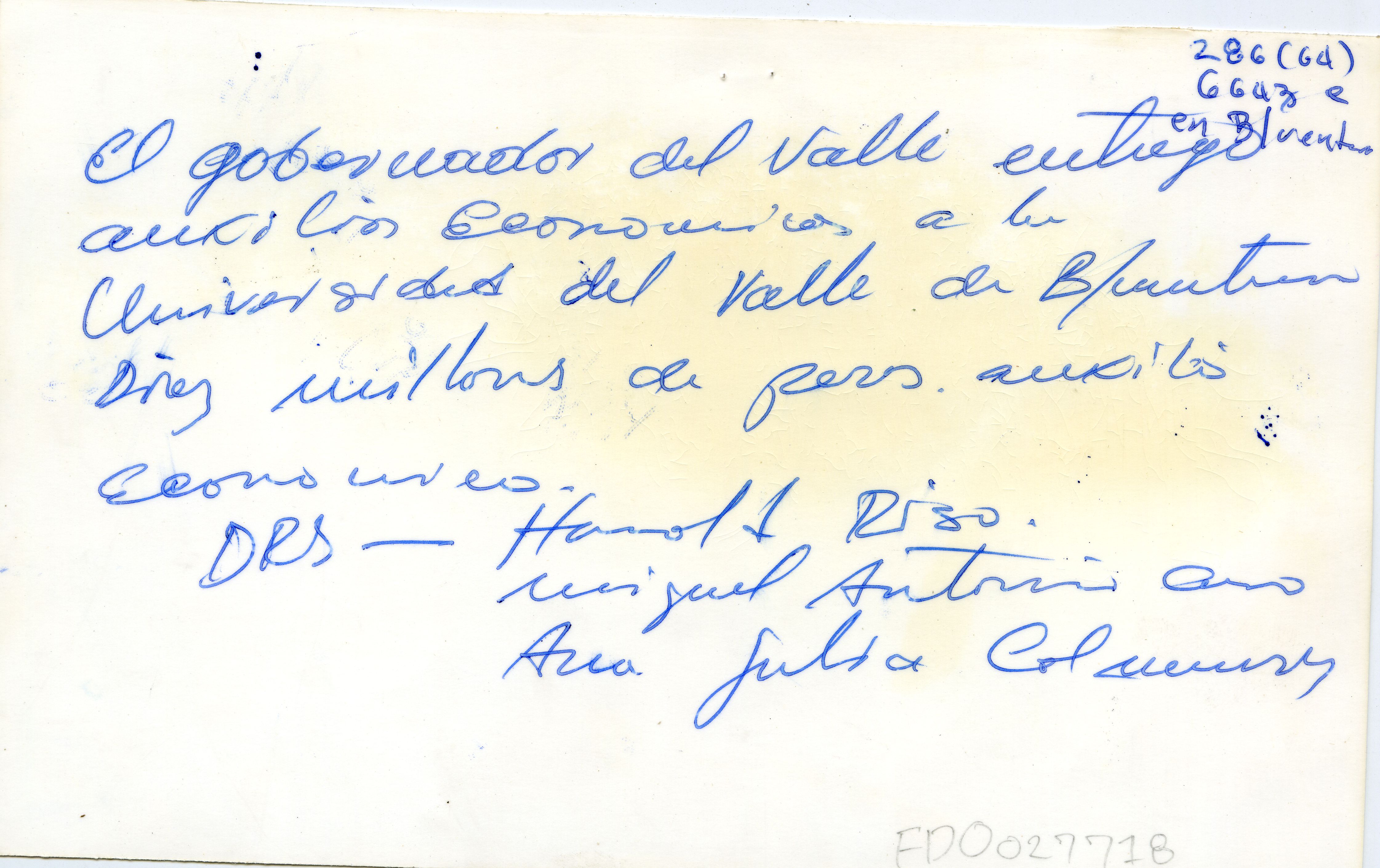 "Manuscrito: El gobernador del Valle entregó auxilios económicos a la Universidad del Valle de Buenaventura. Diez millones de pesos, auxilio económico. DRS: Harol Riso Manuel Antonio Cano Ana Julia (...ilegible)"