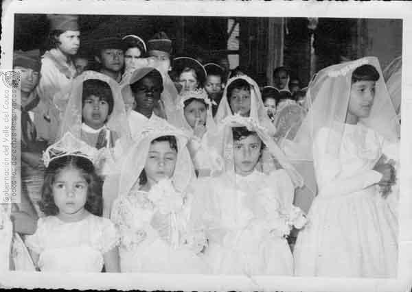 FOTO CASTAÑO (1962). Grupo de niñas en la Celebración de las primeras comuniones & 603045. PRADERA: Biblioteca Departamental Jorge Garces Borrero.