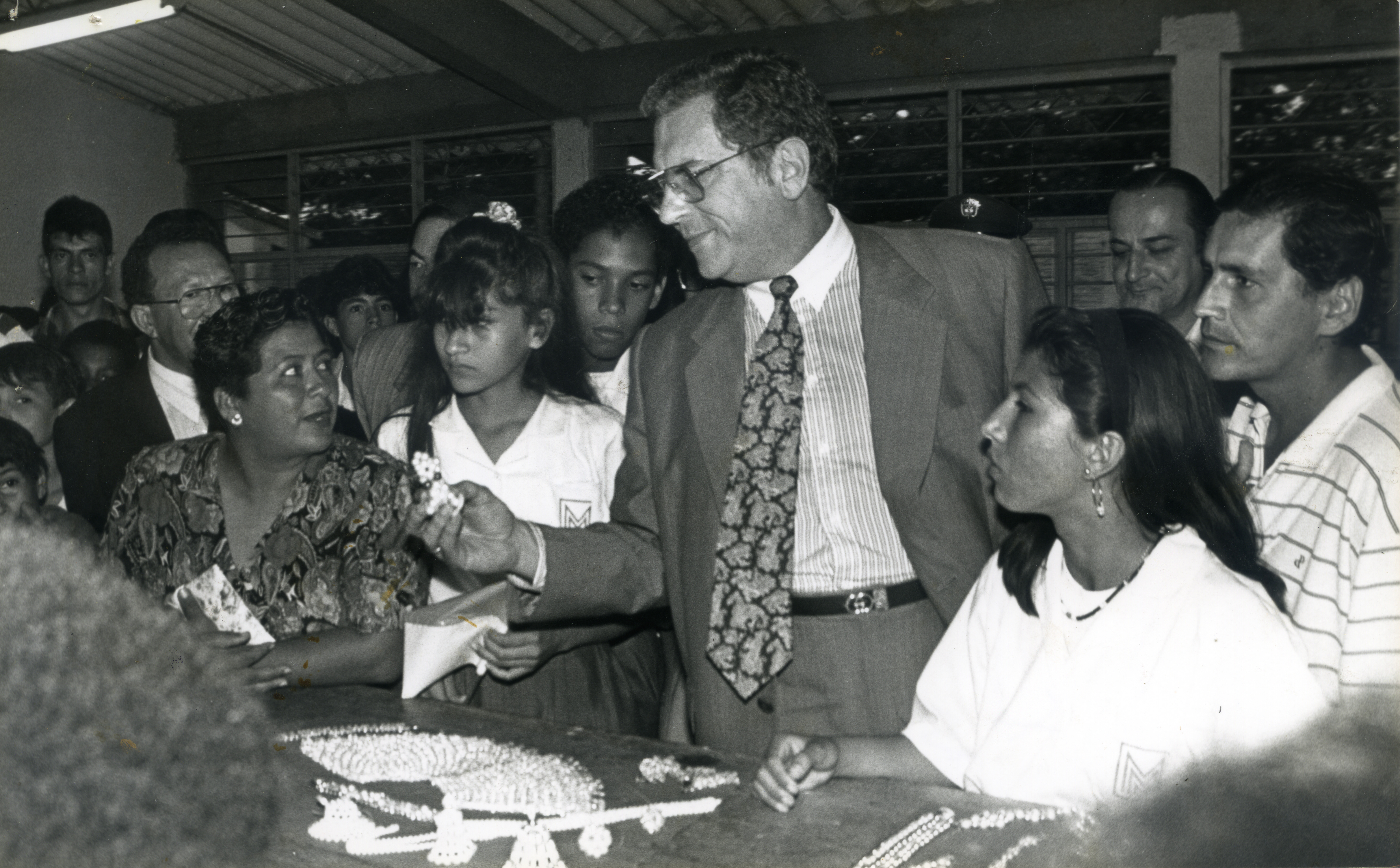 En la fotografía podemos observar al gobernador del Valle, Carlos Holguín Sardi, mirando las manualidades que han realizado las personas pertenecientes a una comunidad vallecaucana.