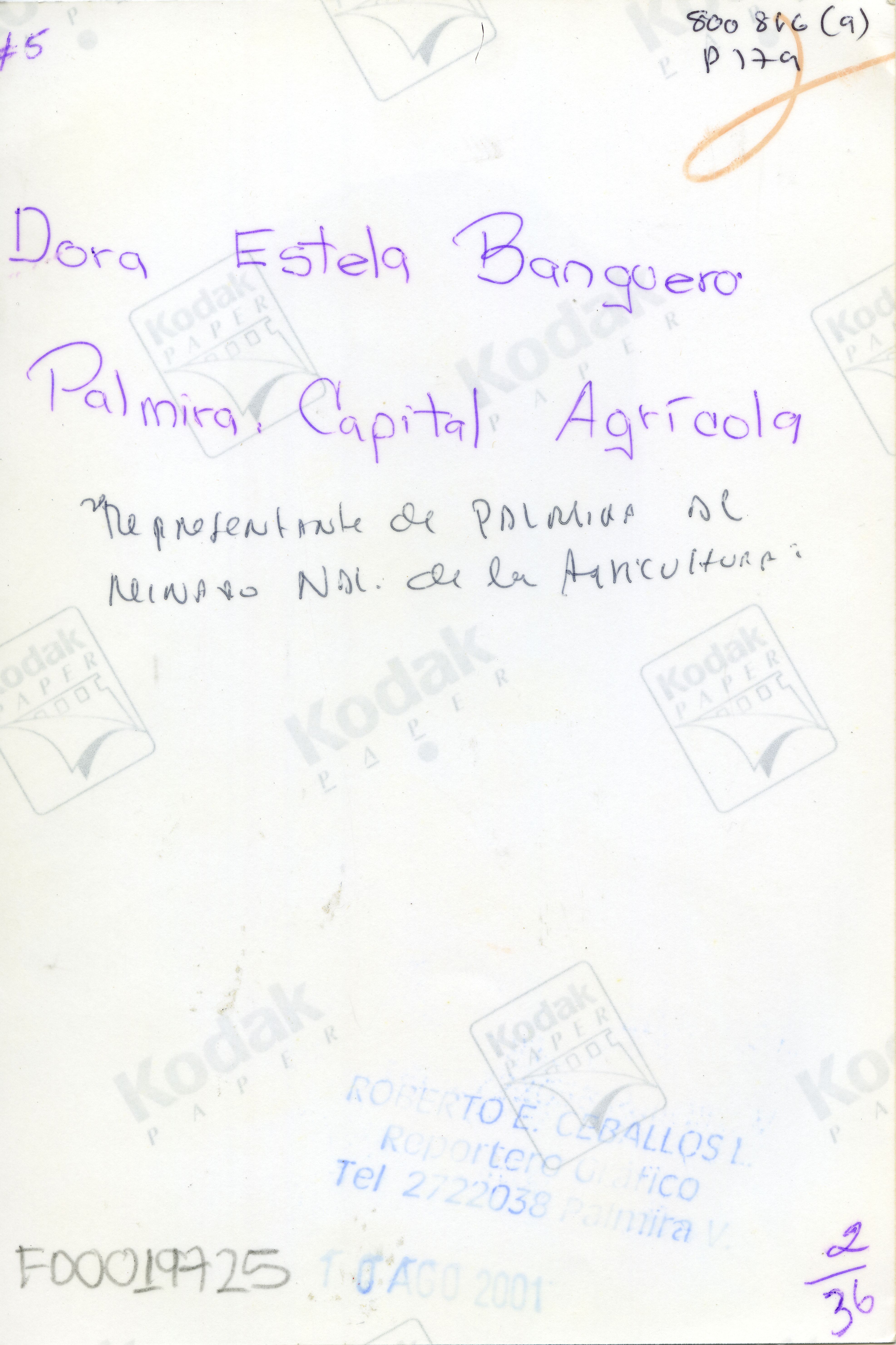 Perfil de participante al Reinado Nacional de la Agricultura, Dora Estela Banguero. Se aprecia sonriendo, vestido azul, cabello suelto y candongas medianas. Palmira Capital Agricola