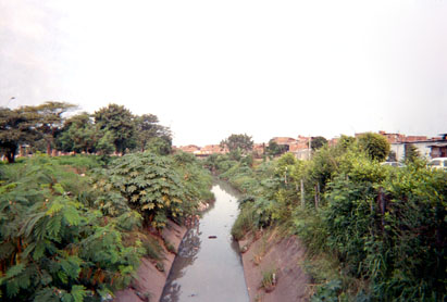 Plano medio. Exterior día. Canal de desagüe en centro de escena, con paralelismo lineal. Vegetación en laterales. Conjunto de casas de fondo.