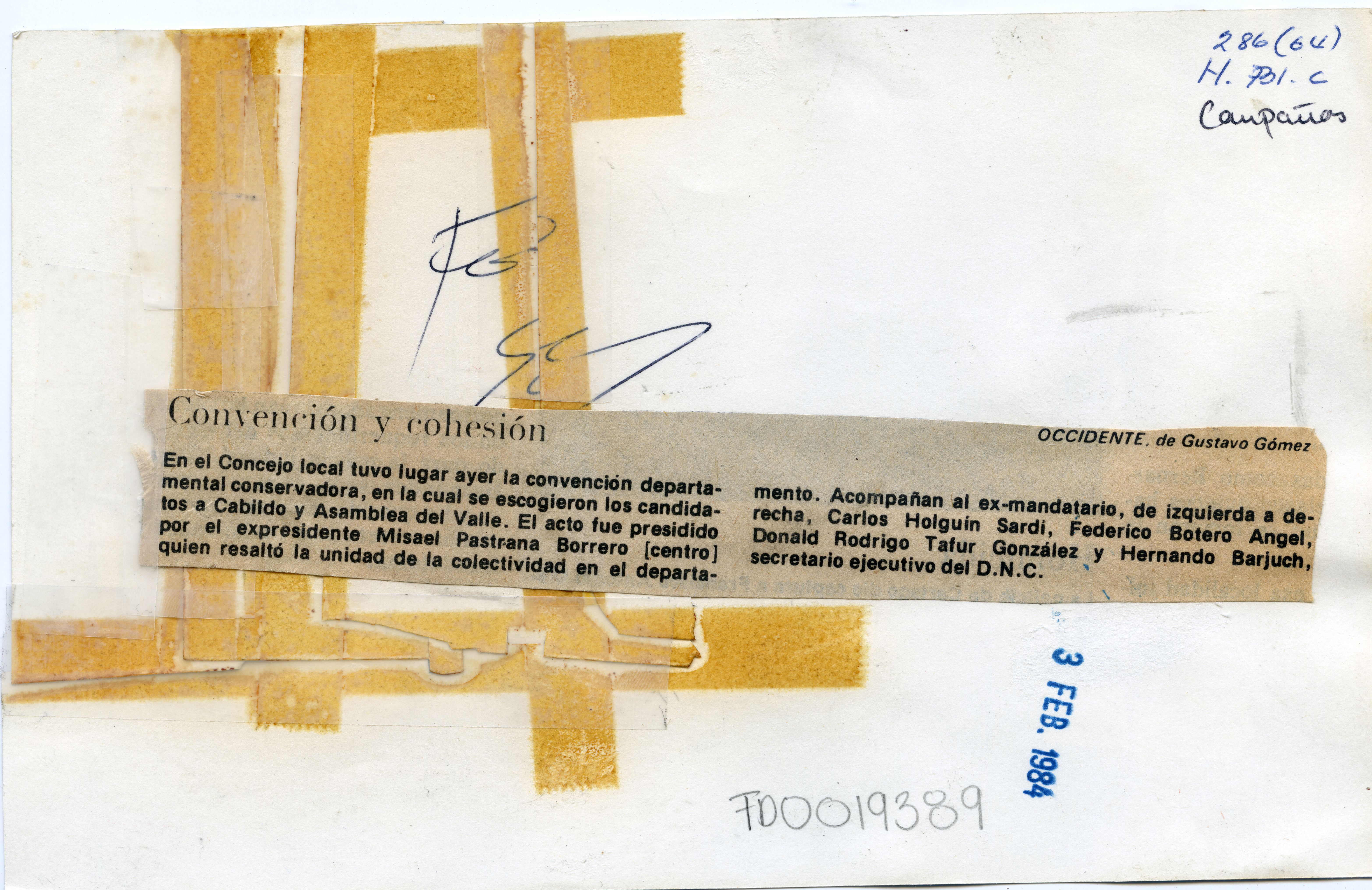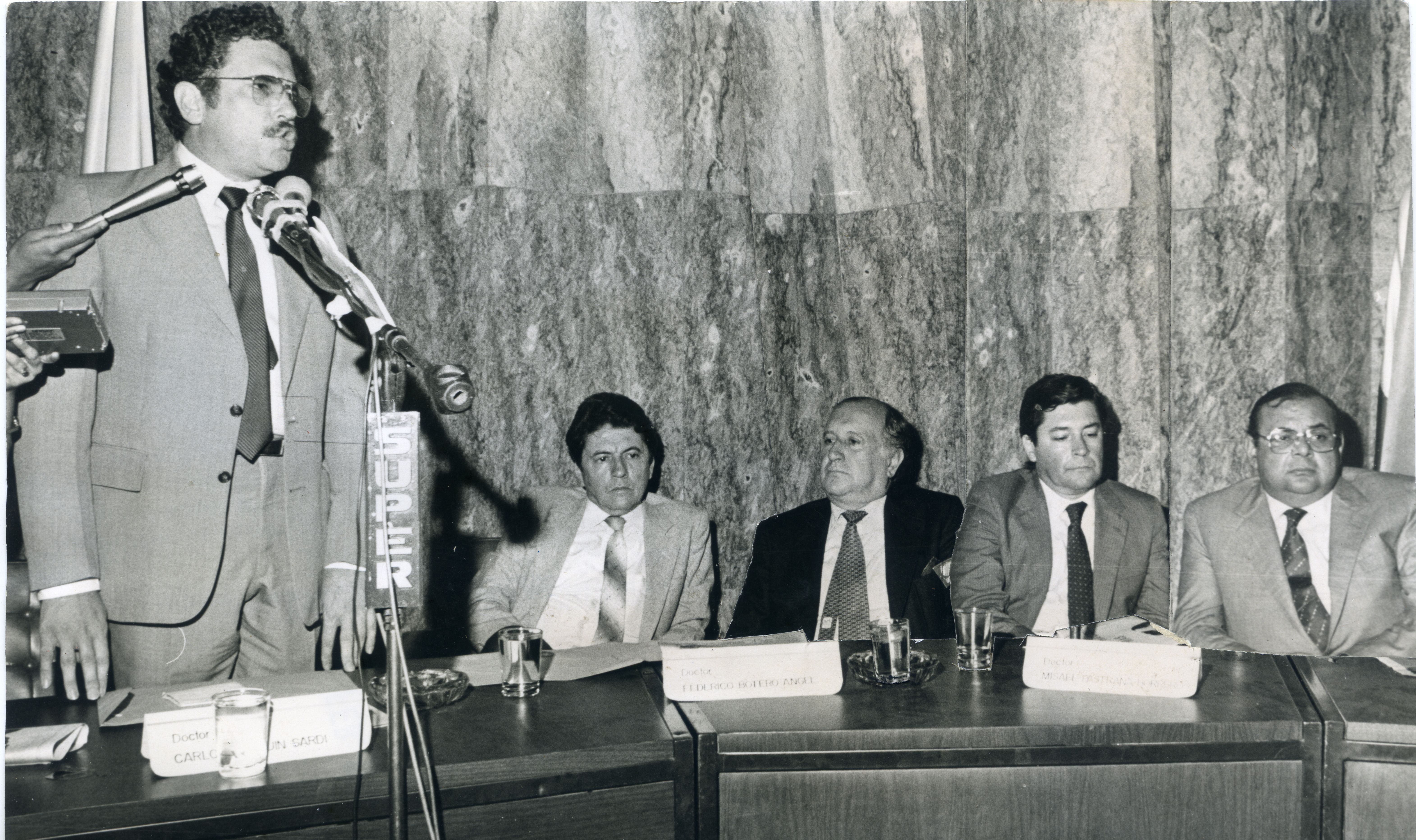 Fotografia de plano medio largo de Carlos Holguin Sardi, donde se observa de saco y corbata, sentado junto a otros dirigentes nacionales y departamentales