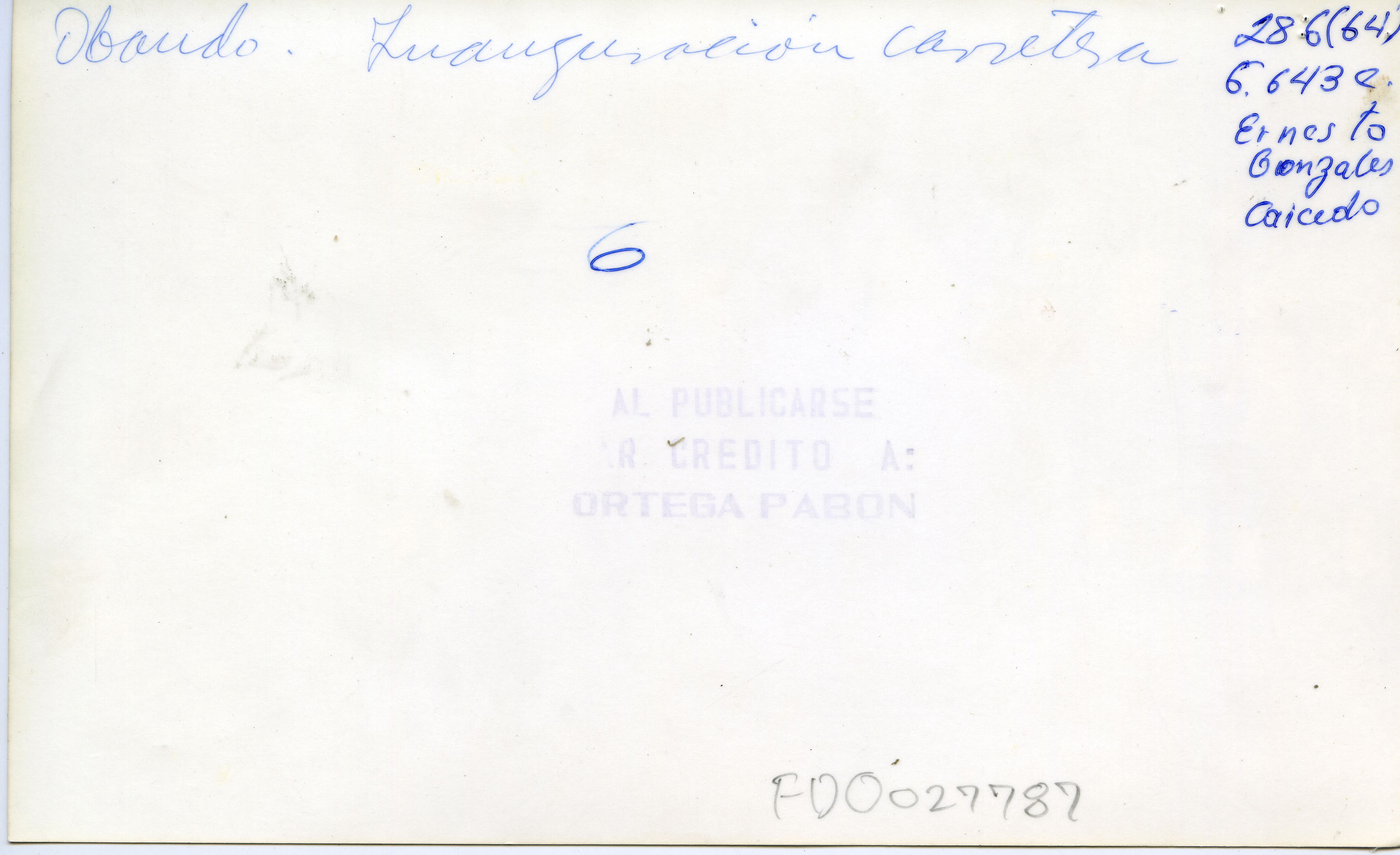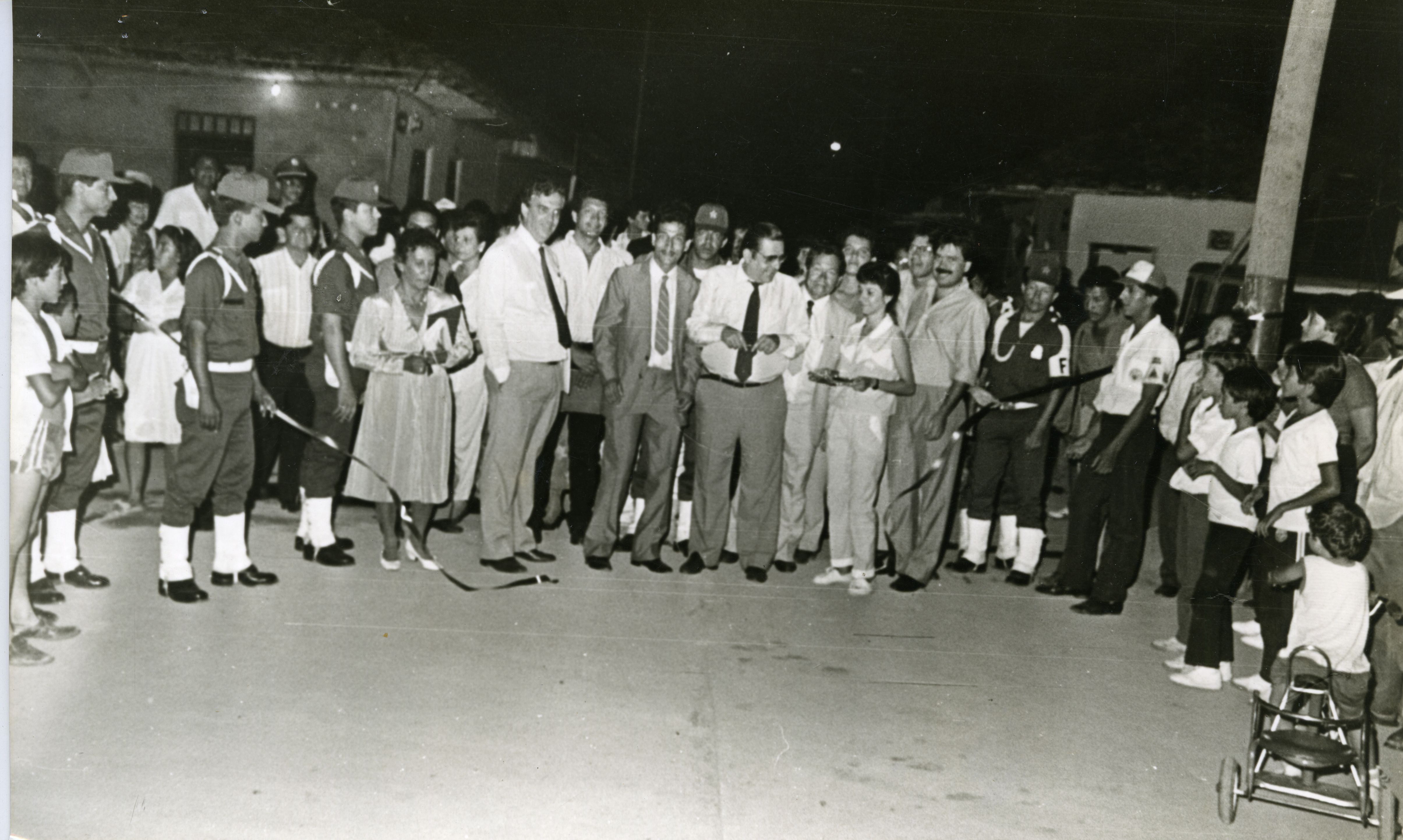 La foto enmarca el momento de apertura de una carretera en el municipio de Obando, en cuadro, el entonces gobernador del Valle del Cauca, Ernesto González Caicedo, terminando de cortar el listón de apertura en un evento frente a la comunidad en compañía de algunos integrantes de la fuerza militar.