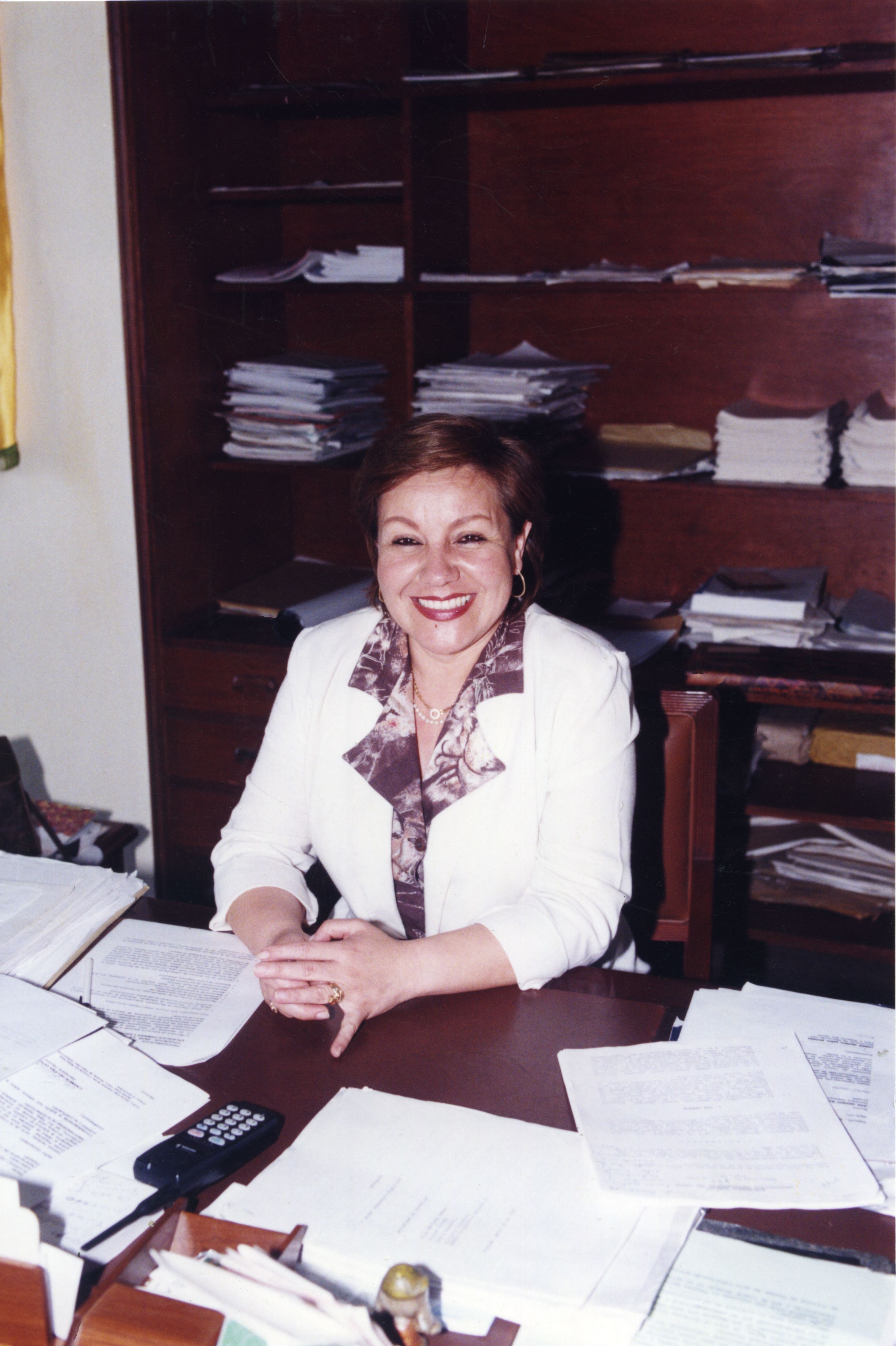 Carmen Argenis Barco Noguera en la oficina sentada revisando documentos.