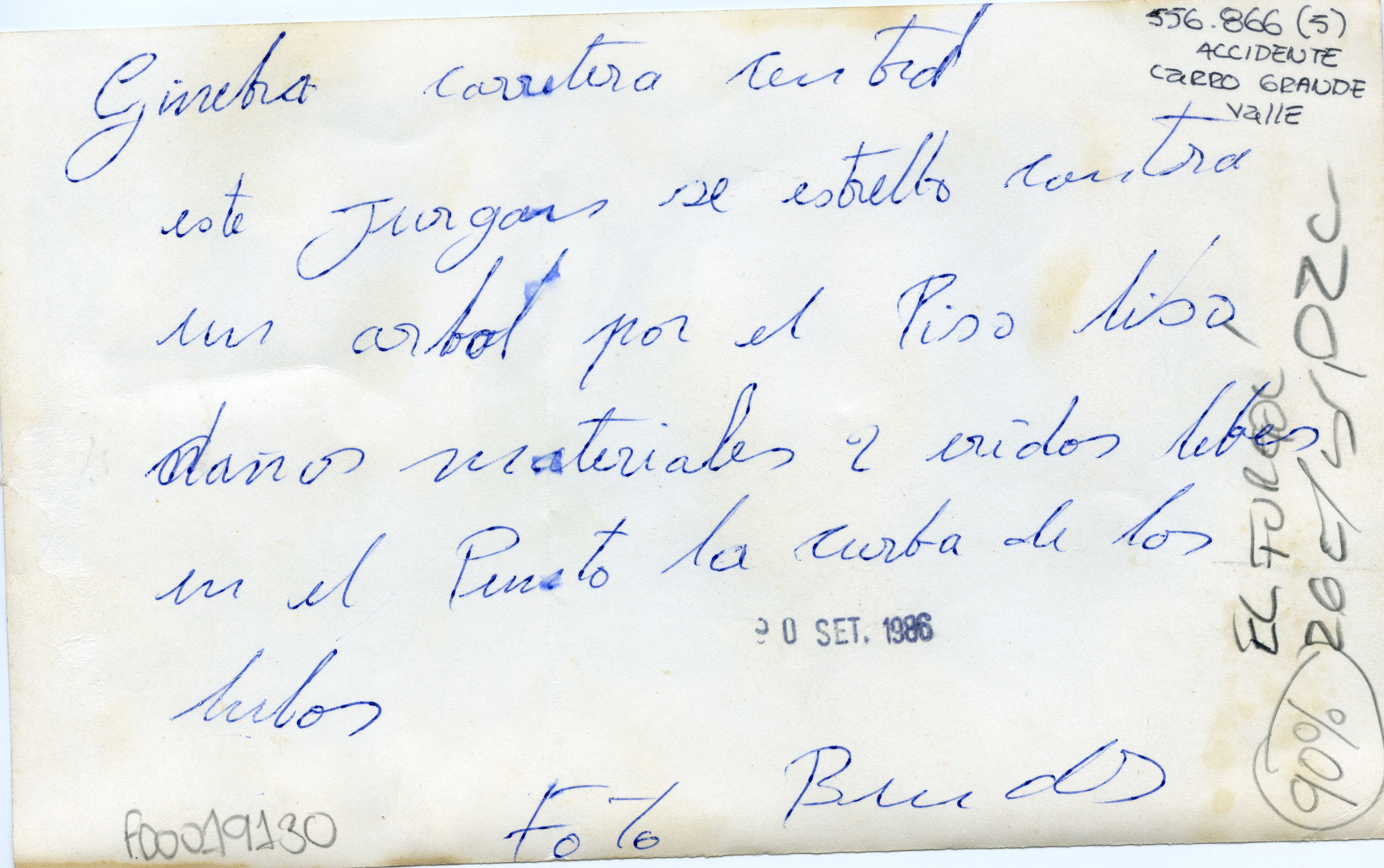 En el registro fotográfico podemos apreciar un furgon con la parte delantera dañada, esto es debido a que tuvo un accidente de tránsito en el que se estrelló contra un árbol. Al reverso de la fotografía se anexa nota manuscrita: "Ginebra carretera central. Este furgón se estrelló contra un árbol por el peso. Hubo daños materiales, 2 heridos leves. En el punto la curva de los lulos."