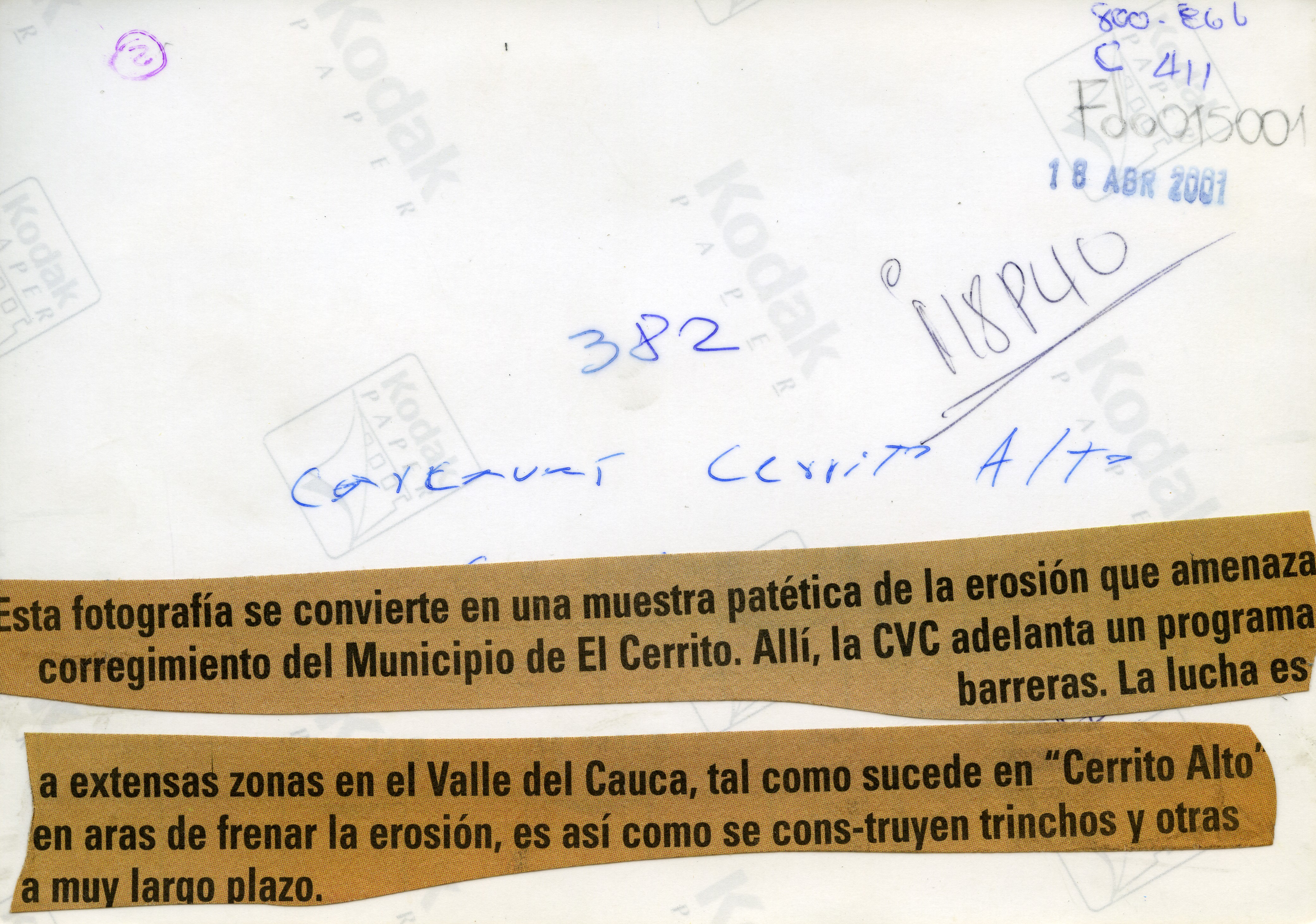 Al reverso de la fotografía se anexa un recorte: "Esta fotografía se convierte en una muestra patética de la erosión que amenaza corregimiento del Municipio de El Cerrito. Allí, la CVC adelanta un programa barreras. La lucha es a extensas zonas en el Valle del Cauca, tal como sucede en "Cerrito Alto" en aras de frenar la erosión, es así como se cons-truyen trinchos y otras a muy largo plazo."