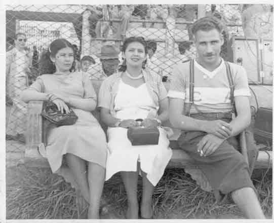 Saturia Rubiano, Blanca Méndez y Pedro Fichera, ciclísta Argentino que vino a competir al Esadio Pascual Guerrero durante unas olimpiadas. Santiago de Cali, 1950.