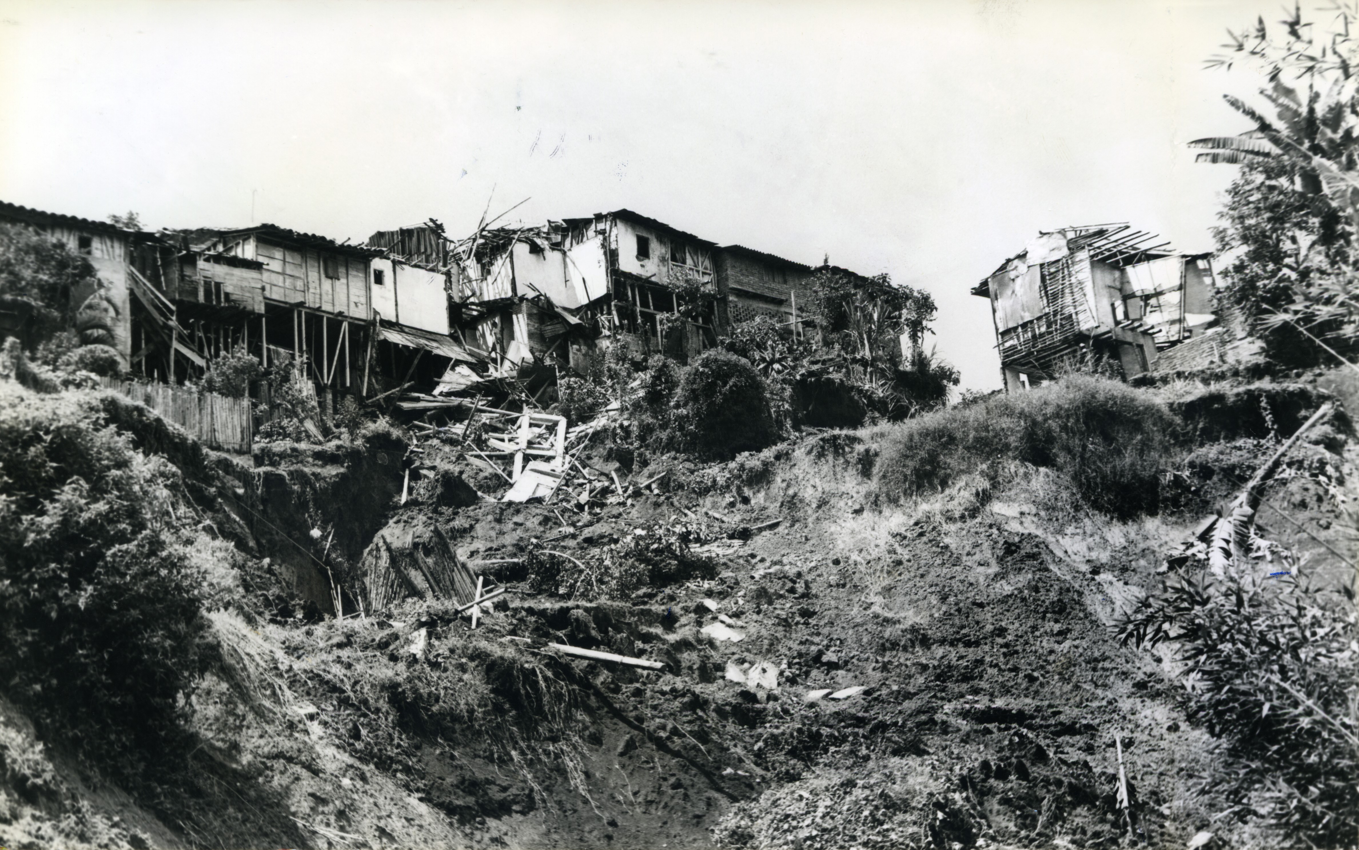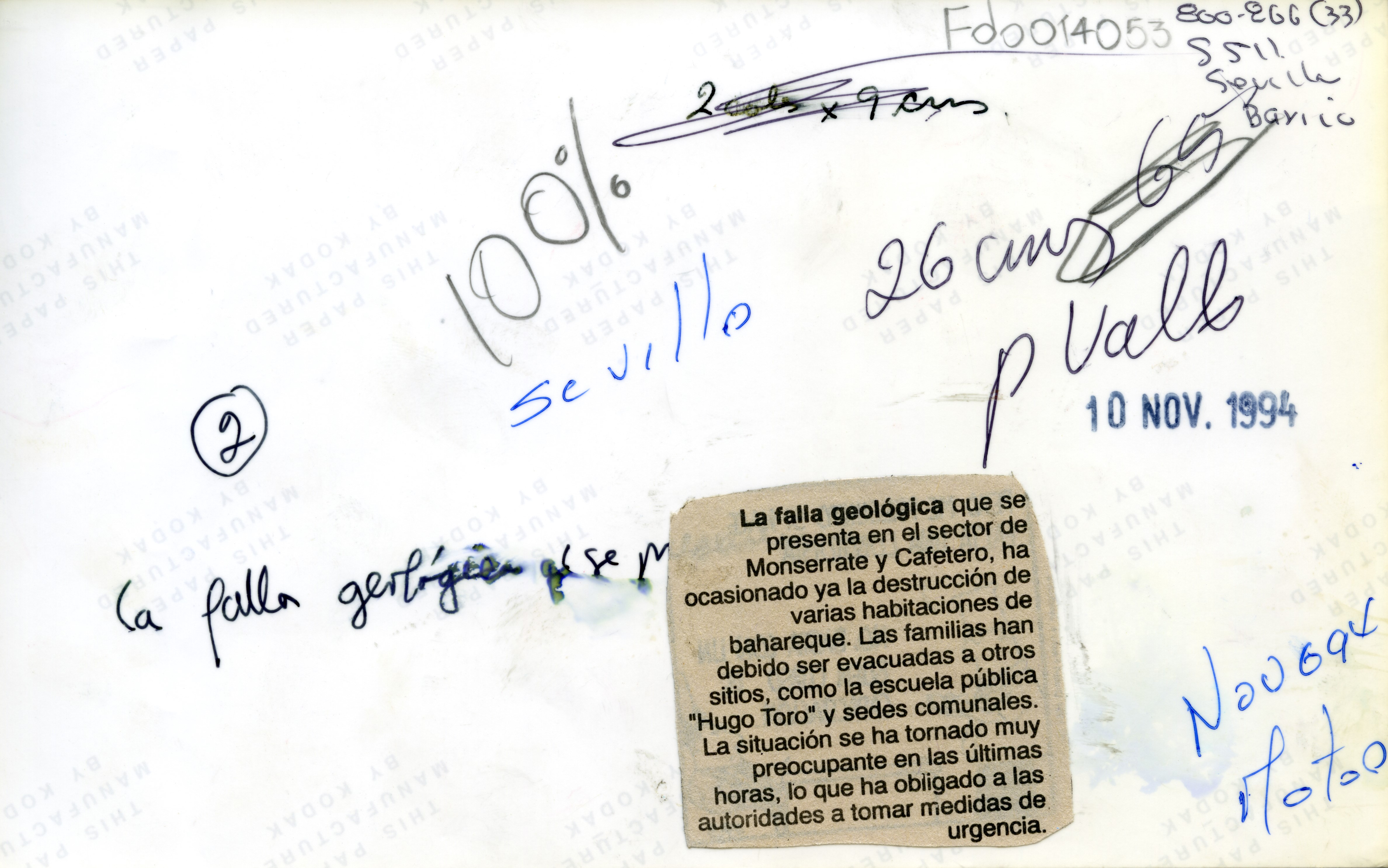 Al reverso de la fotografía dice lo siguiente: "La falla geológica que se presenta en el sector de Monserrate y Cafetero, ha ocasionado ya la destrucción de varias habitaciones de bahareque. Las familias han debido ser evacuadas a otros sitios, como la escuela pública "Hugo Toro" y sedes comunales. La situación se ha tornado muy preocupante en las últimas horas, lo que ha obligado a las autoridades a tomar medidas de urgencia".