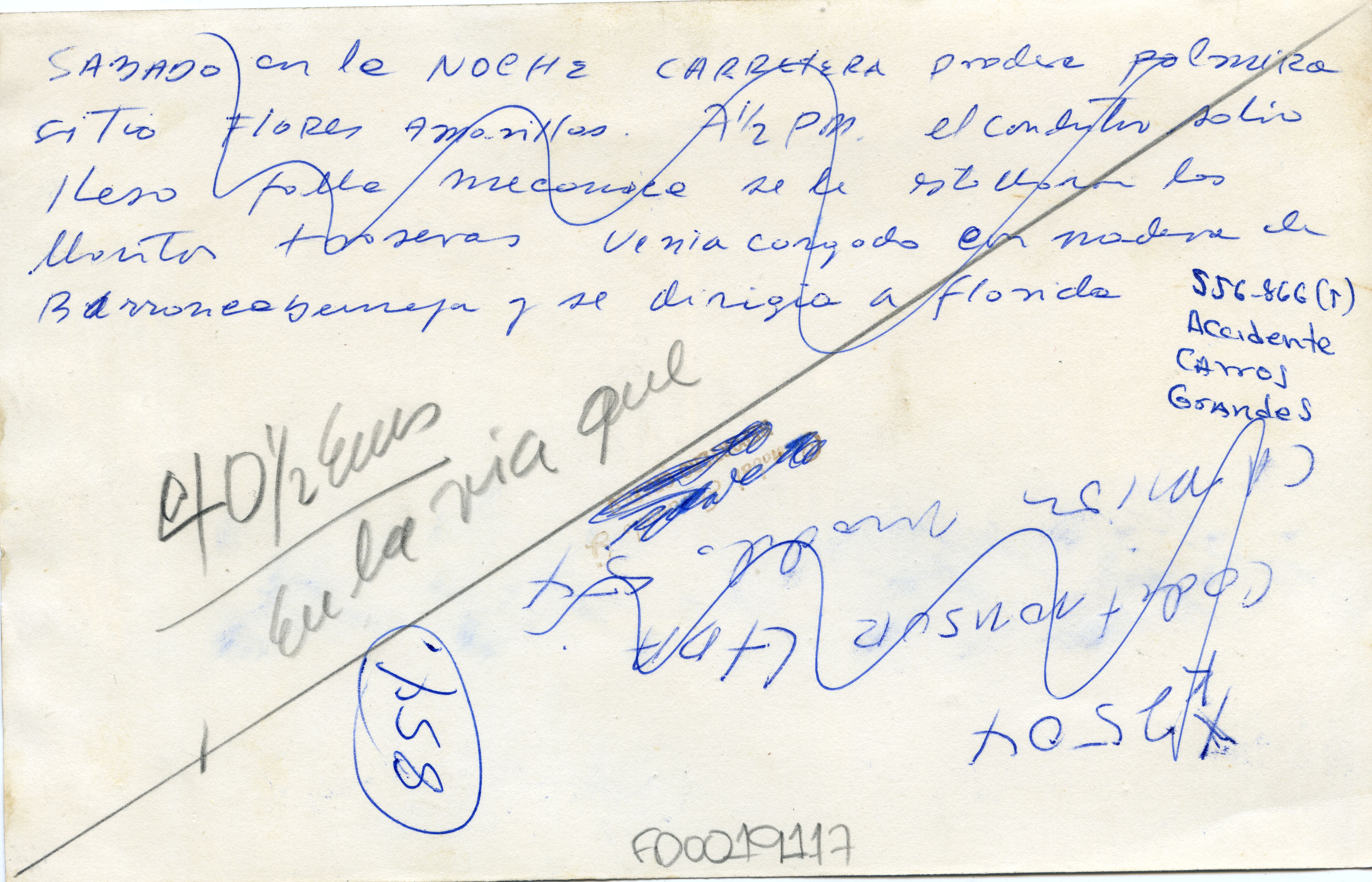 En la fotografía podemos observar un accidente de tránsito en el que un camión grande se volcó, el vehículo iba cargado de madera y se dirigía a Florida. Al reverso de la fotografía se anexa nota manuscrita: " Sábado en la noche carretera produce ceniza. Sitio flores amarillas 7 1/2pm. El conductor salió ileso. Falla mecánica, se le estallaron las llantas traseras. Venía cargado con madera de Barrancabermeja y se dirigía a Florida."