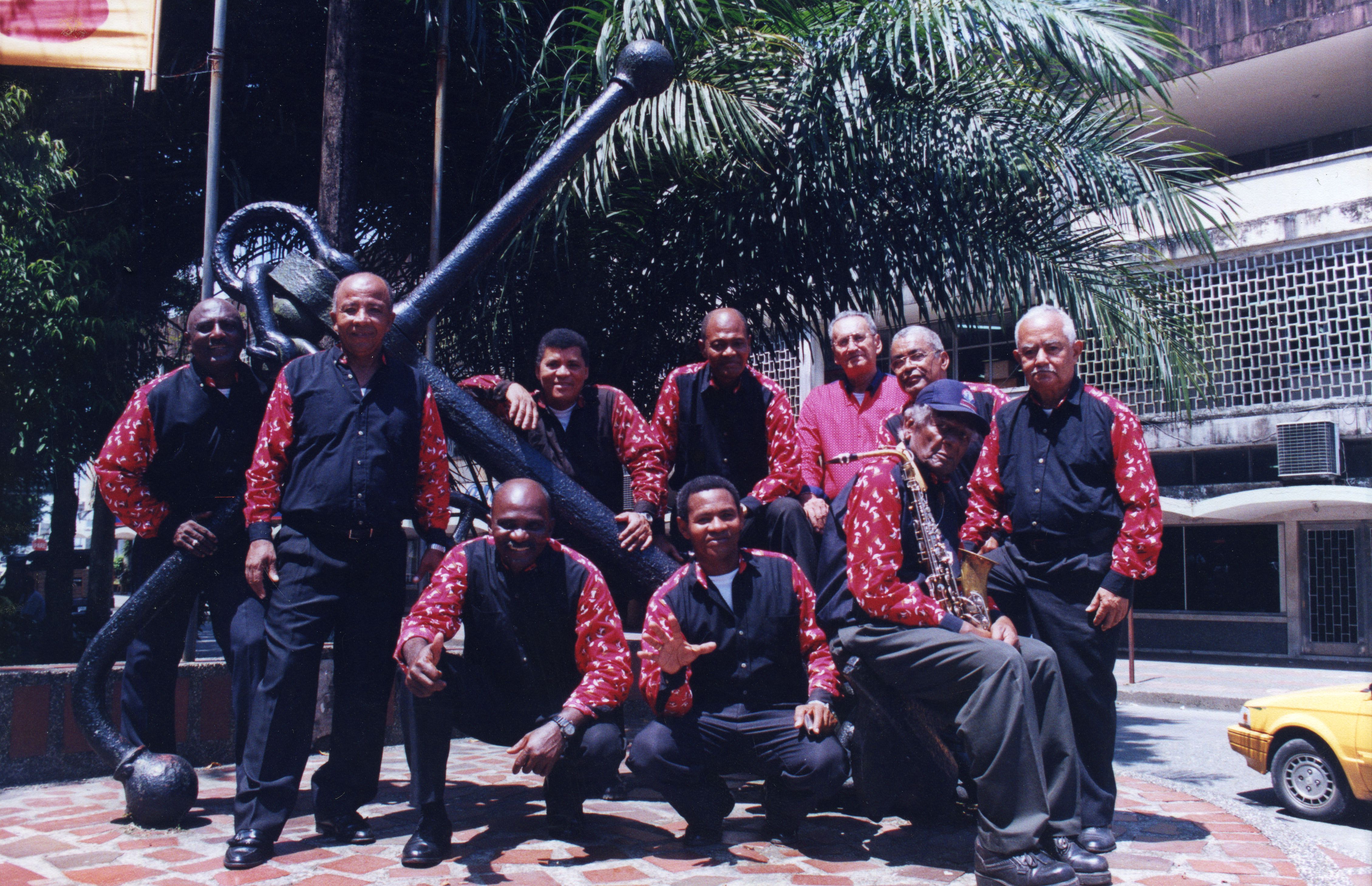 " Fotografía de plano general y ángulo normal. En la composición gráfica de la imagen es posible distinguir a una agrupación musical, quienes visten camisas de botón de color negro y mangas rojas, pantalón negro y zapatos de cuero. La agrupación posa junto con un ancla para la foto. uno de los integrantes carga un saxofón. "