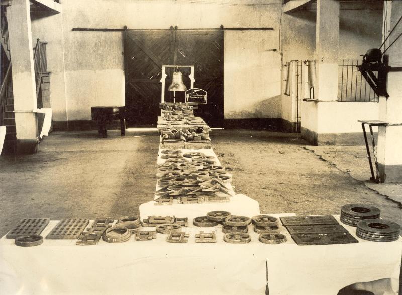 Escuela de Artes y oficios, exposición de los trabajos elaborados por los estudiantes en el taller de fundición. Esta institución se creo por Acuerdo Municipal No 25 de 1933, que ordeno construir una escuela de formación técnico-práctica, para dar respuesta a la necesidad de mano de obra capacitada, requerida por el crecimiento industrial y urbano de la ciudad. A partir de 1945 se le empezo a llamar Instituto Antonio José Camacho. Actualmente lo conocemos como Instituto Educativo Técnico Industrial Antonio José Camacho. Santiago de Cali, fecha aproximada, 1940.