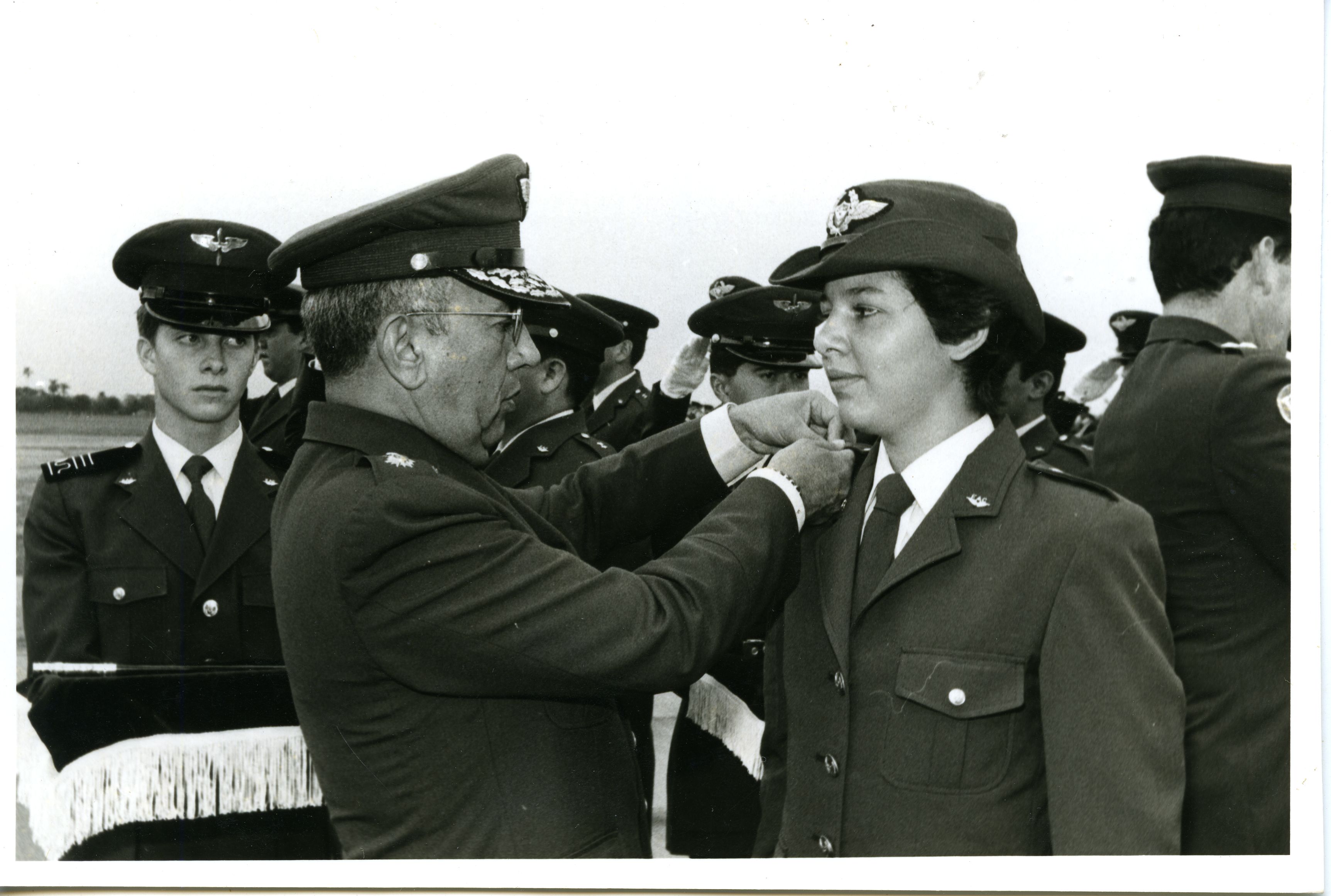Reverso:"En la gráfica se aprecia momentos en que el Sr. Mg. Alfredo Ortega Caicedo impone las insignias de teniente a la señorita Yaneth Martínez, en la ceremonia precedida por altos mandos militares, llevada a cabo en la Escuela Militar de Aviación "Marco Fidel Suárez"."