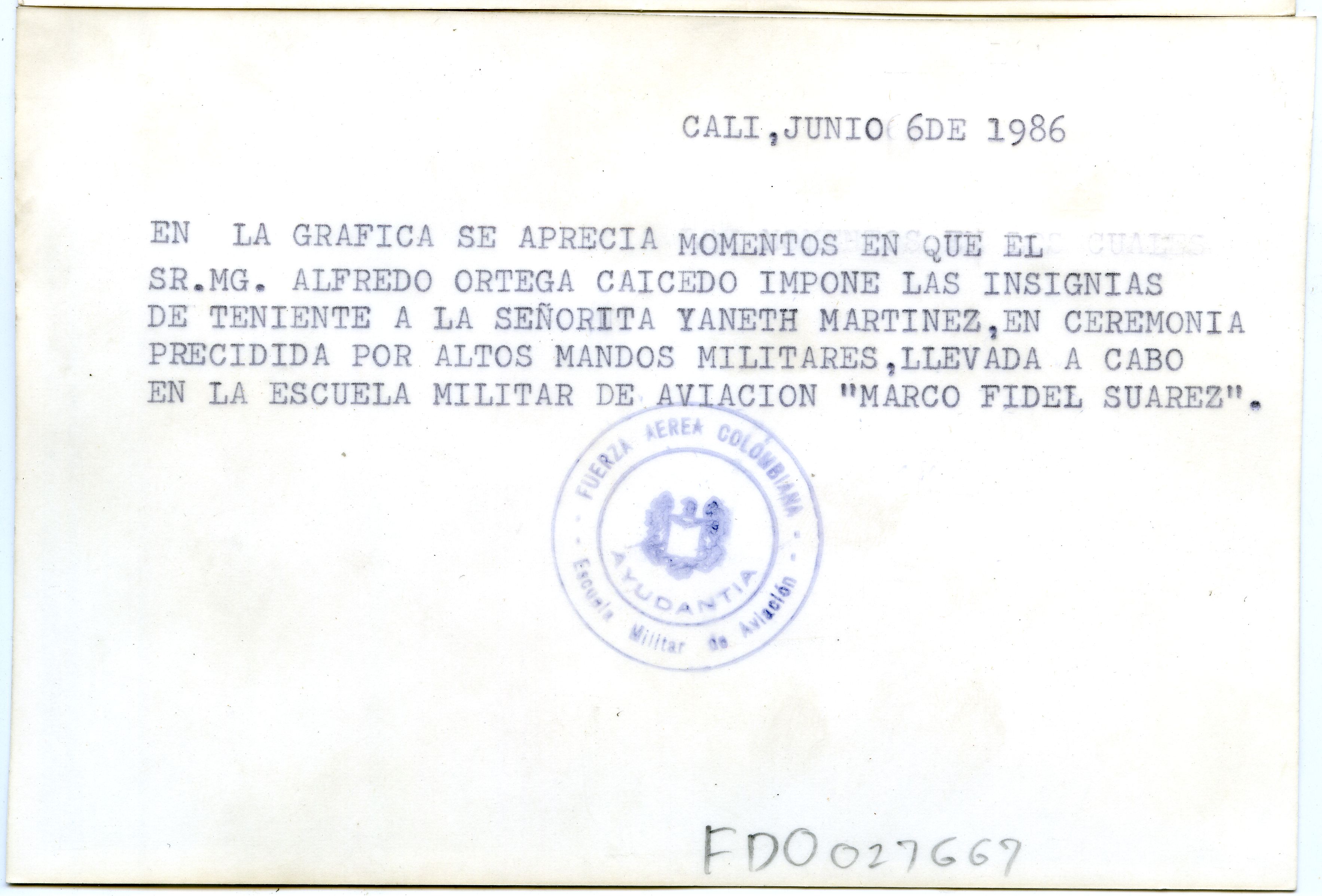 | dc.description.abstract | Reverso:"En la gráfica se aprecia momentos en que el Sr. Mg. Alfredo Ortega Caicedo impone las insignias de teniente a la señorita Yaneth Martínez, en la ceremonia precedida por altos mandos militares, llevada a cabo en la Escuela Militar de Aviación "Marco Fidel Suárez"." | spa |