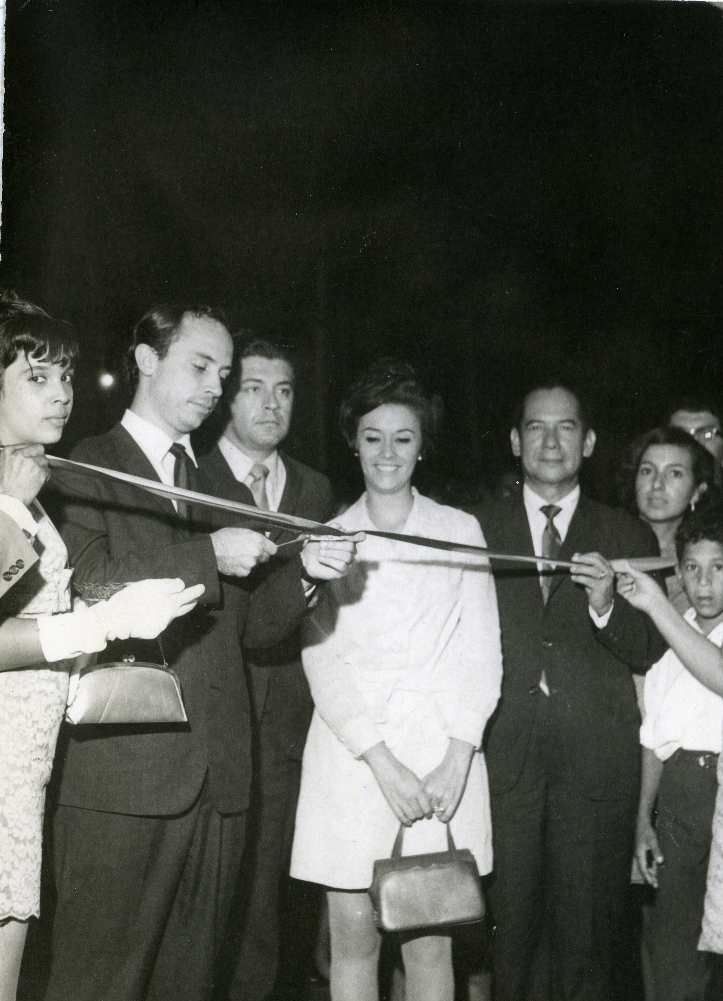 Fotografía plano medio largo de Rodrigo Lloreda Caicedo, se observa con traje y corbata, cortando una cinta