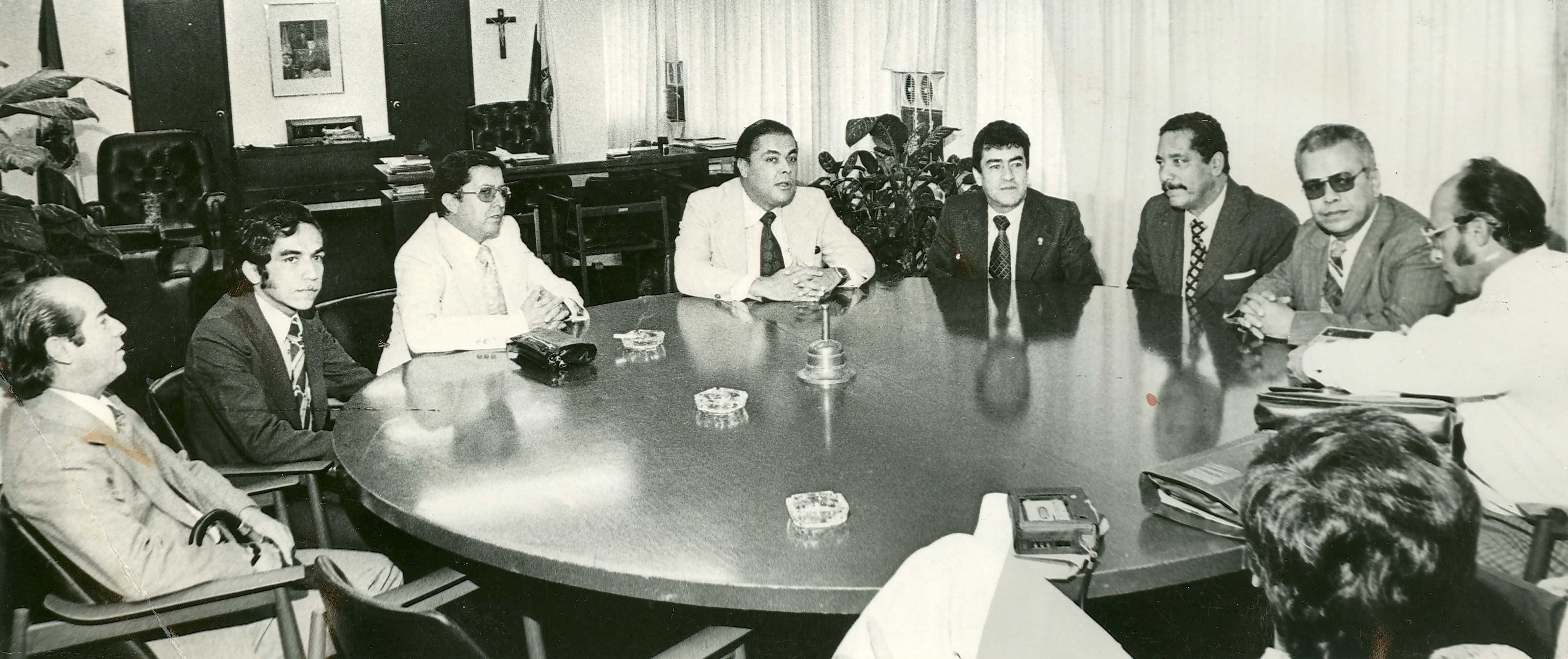 Diario Occidente (1979). Rodrigo Escobar Navia, alcalde de Cali, en reunión con los organizadores del 4° Simposio Nacional sobre Revisión Fiscal. Santiago de Cali: Biblioteca Departamental Jorge Garcés Borrero.
