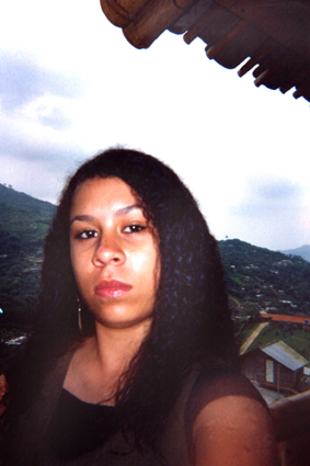 Autorretrato de la autora. Un techo de guadua surge de la parte superior derecha. Al fondo barrio de ladera y cielo despejado.