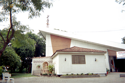 Iglesia en el barrio Camino Real. Vegetación al lado izquierdo. Plano general.
