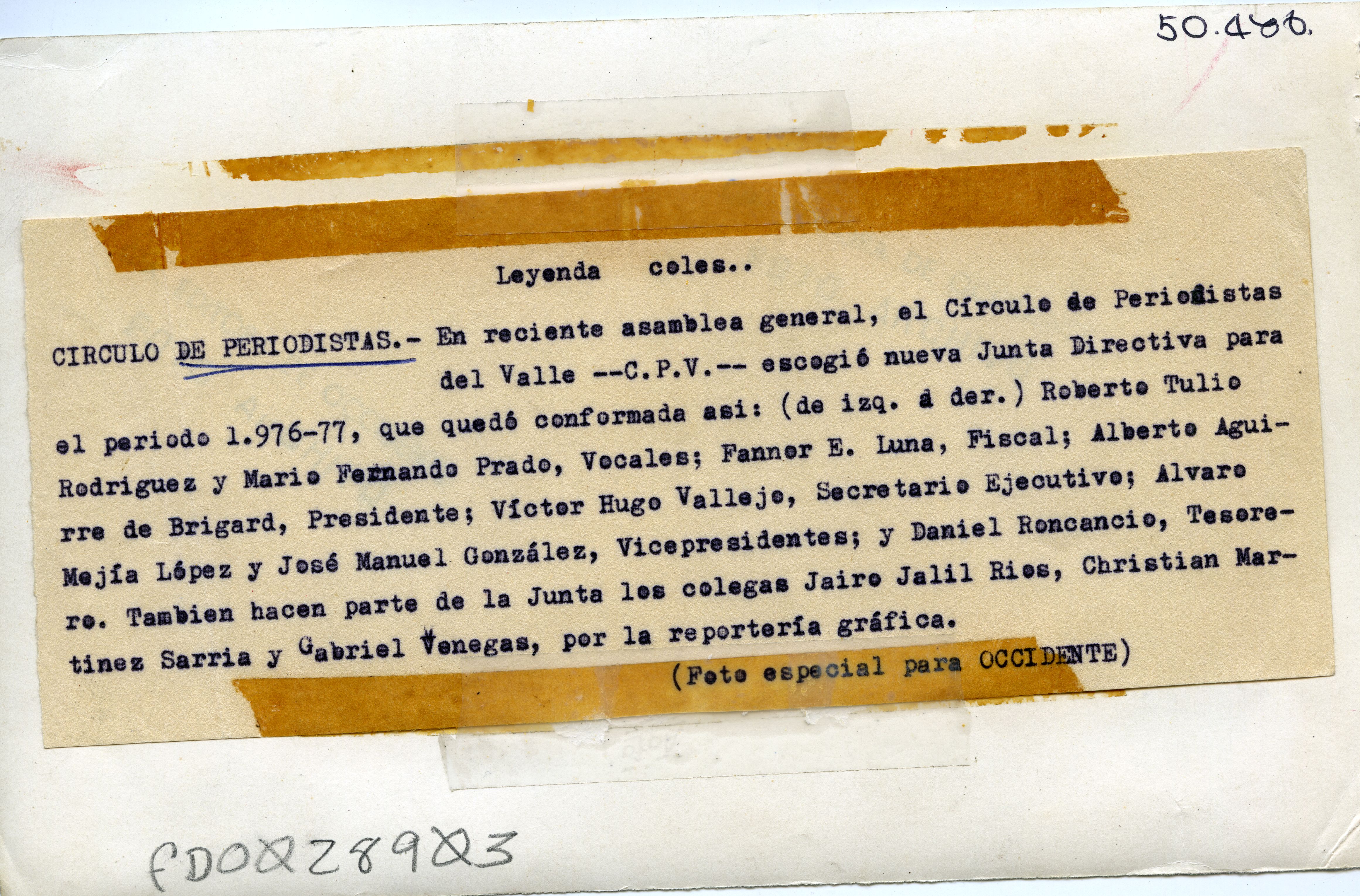 Reverso “Círculo de periodistas Leyenda Coles… En la reciente asamblea general, el Círculo de periodistas del Valle --C.P.V-- escogió nueva junta directiva para el periodo 1976-77, que quedó conformada así: (de izq. a der) Roberto Tulio Rodríguez y Mario Fernando Prado, Vocales; Fannor E. Luna, Fiscal; Alberto Aquelarre de Brigard, Presidente; Víctor Hugo Vallejo, Secretario Ejecutivo; Álvaro Mejía López y José Manuel González, Vicepresidentes; y Daniel Roncancio, Tesorero. También hacen parte de la junta los colegas Jairo Jalil Ríos, Christian Martínez Sarria y Gabriel Venegas, por la repostería grafía. (Foto especial para OCCIDENTE)”