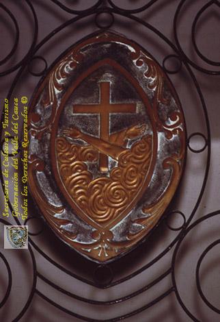 Escudo con crucifijo en metal repujado. Capilla de la Inmaculada, Convento de San Joaquín, Santiago de Cali. 1990.