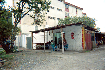 Castro Martínez, F. (2005). Hombres sentados en exterior de tienda a la entrada de un parqueadero. Santiago de Cali: Biblioteca Departamental Jorge Garces Borrero.