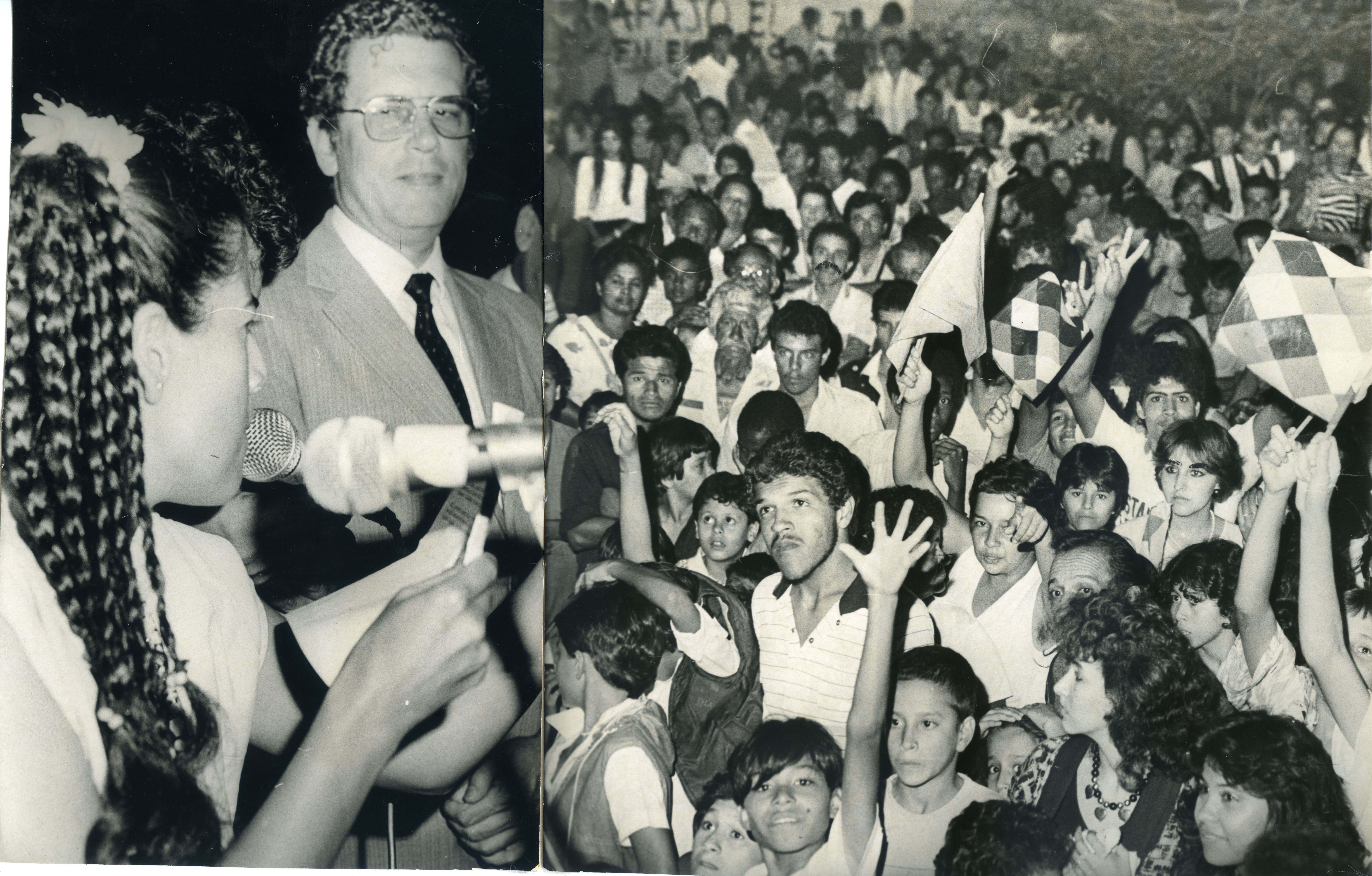 En la fotografía podemos observar a Carlos Holguín en una de sus campañas políticas en la ciudad de Cali. Al reverso de la fotografía se anexa recorte: "Holguinista...donde la juventud de uno y otro sexo tuvo una amplia...el senador Carlos Holguin Sardi, en la noche del... en el barrio El Jardin, de Cali. El coordinador de la campaña el candidato Alvaro Gómez Hurtado y jefe del holguinismo, invitó a sus partidarios a respaldar ese nombre para la presidencia de la República, señalando que es prenda de garantía para los colombianos y factor de progreso para el país."