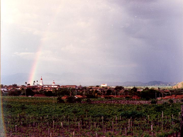 Fenómeno del Arco Iris durante un atardecer en el municipio. Observese en un primer plano el campo plantado de vides. La Unión,1989