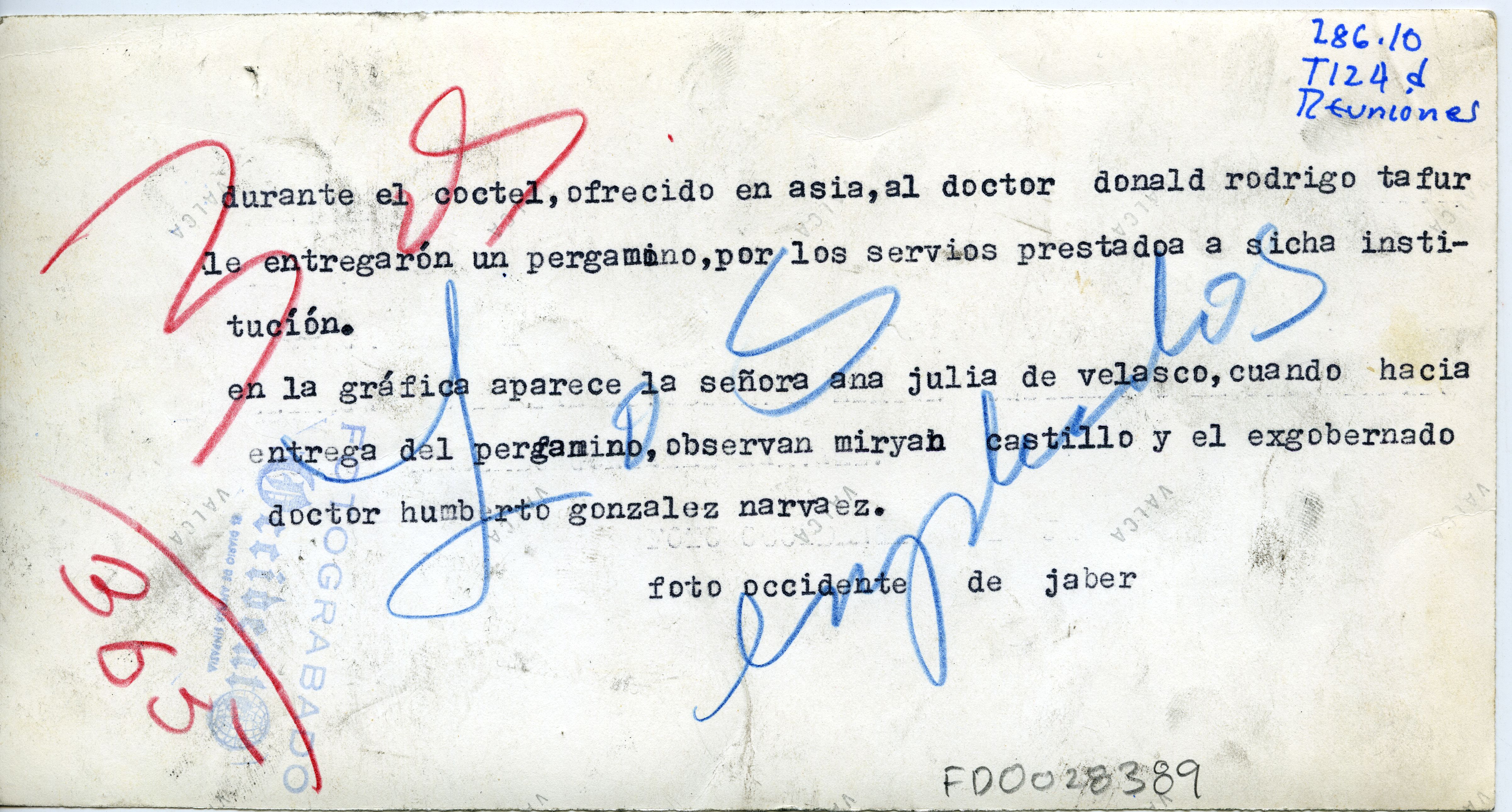 | dc.description.abstract | Reverso:"Durante el cóctel, ofrecido en asia, al doctor Donald Rodrigo Tafur le entregaron un pergamino, por los servicios prestado a sicha institución. En la gráfica aparece la señora Ana Julia de Velasco, cuando hacia entrega del pergamino, observan Miryan Castillo y el exgobernador doctor Humberto González Narváez." | spa |