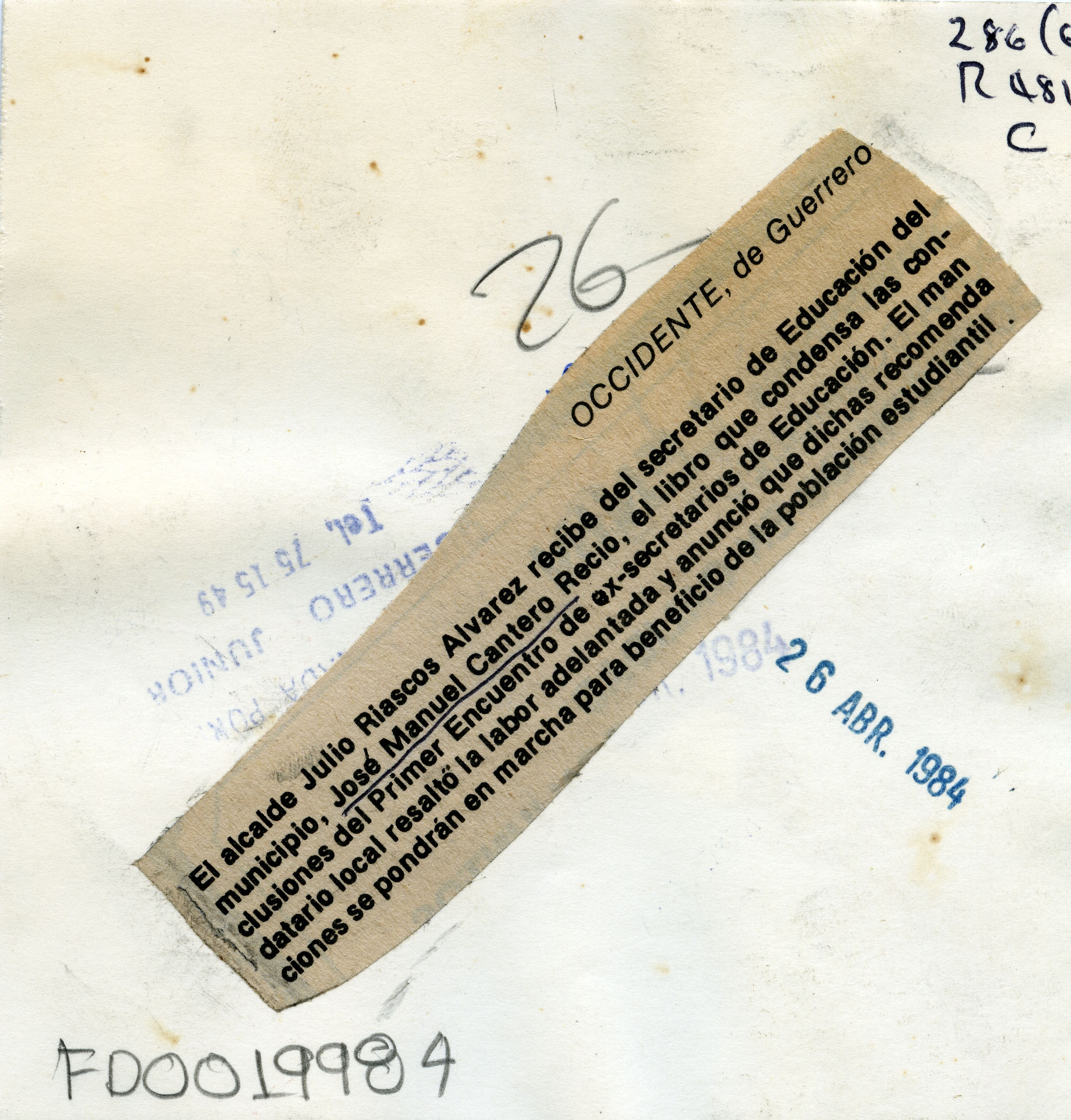 Reverso: El alcalde Julio Riascos Álvarez recibe del secretario de educación del municipio, José Manuel Cantero Recio, el libro que condensa las conclusiones del primer encuentro de exsecretarios de Educación. El mandatario local resalto la labor adelantada y anunció que dichas recomendaciones se pondrán en marcha para beneficio de la población estudiantil