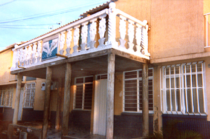 | dc.description | Plano medio. Toma realizada en exterior, donde se puede apreciar la fachada de una vivienda de dos plantas con muros de color crema y un balcón blanco con una placa en el centro con forma de delfines. | spa |