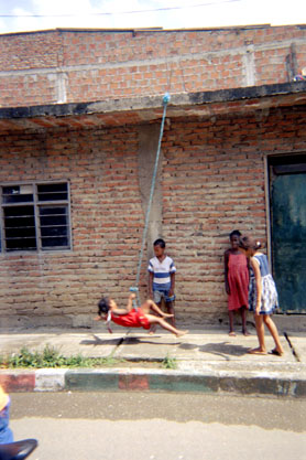 | dc.description | Plano medio. Exterior día. Niños jugando sobre acera. Se destaca niña en columpio en congelación de movimiento. Sobresale superficie rugosa de pared. | spa |