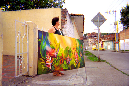 Plano general. Mujer en plano medio parada sobre el andén mirando al lado opuesto de la cámara y sosteniendo un cuadro colorido y de gran formato. Al fondo y a la derecha se puede ver la profundidad de campo del fondo de la calle. A la derecha de la imagen una señal de trásito por la parte de atrás. Día nublado.