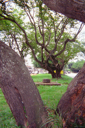 Plano medio. En el medio el tronco de un árbol, que se bifurca para enmarcar otro árbol al fondo. Imagen tomada con luz día.
